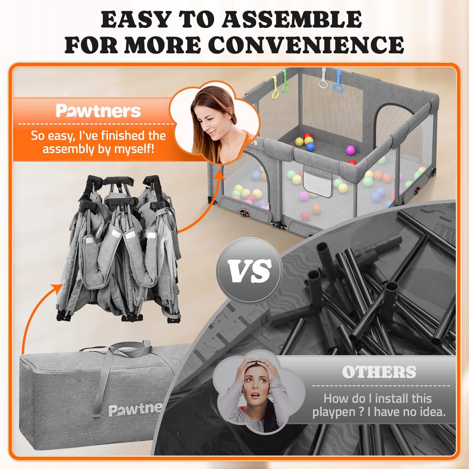EXTRA LARGE BABY PLAYPEN: Pawtners play pen provides a spacious play area for babies and toddlers, measuring 50"L x 50"W x 27"H. It offers plenty of space for your little one to play, crawl and explore freely, and can also accommodate your family inside for happy family time together.