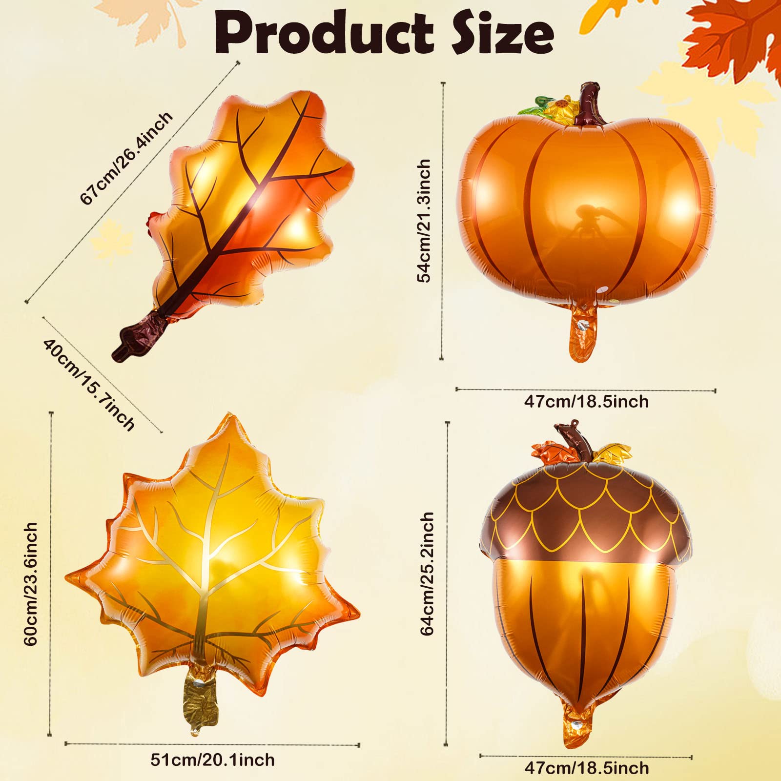 Features: ----The maple leaf shape balloons are made of premium foil. The durable and thick material makes sure that the air in them lasts for hours. ----Our fall leave balloons can be inflated easily with air. These colorful foil balloons can be automatically sealed after inflation. ----These fall birthday balloons can be applied to decorate fall-themed parties, Thanksgiving parties, birthday parties, autumn harvest festivals, and so on. Specification: Material: Aluminum foil Size: Pumpkin Balloons: 21.3 x 18.5 inch Acorn Balloons: 25.2 x 18.5 inch Yellow Maple Leaves Balloons: 23.6 x 20.1 inch Yellow Leave Balloons: 26.4 x 15.7 inch Color: Multicolor Package Includes: 4 x Pumpkin Balloons 4 x Acorn Balloons 4 x Yellow Maple Leaves Balloons 4 x Yellow Leave Balloons