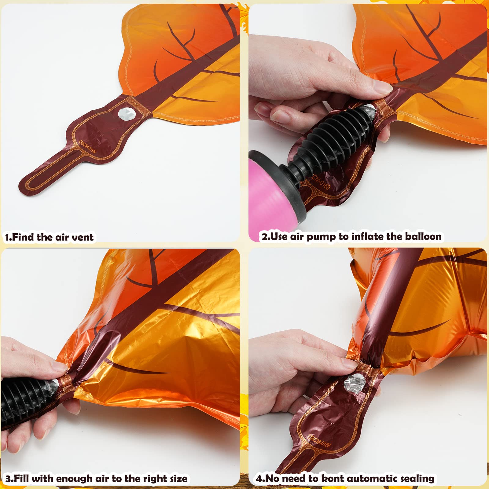 【Automatic Sealing】 These pumpkin balloons are easy to use and carry. Only need to find an inflatable port, Inflate the foil flower balloons to 90%, after inflation squeezes the inflatable port with your fingers, and will automatically seal, do not inflate too much to affect the use. These leaf balloons have holes, easy threaded, and hang where you need or hold them directly.