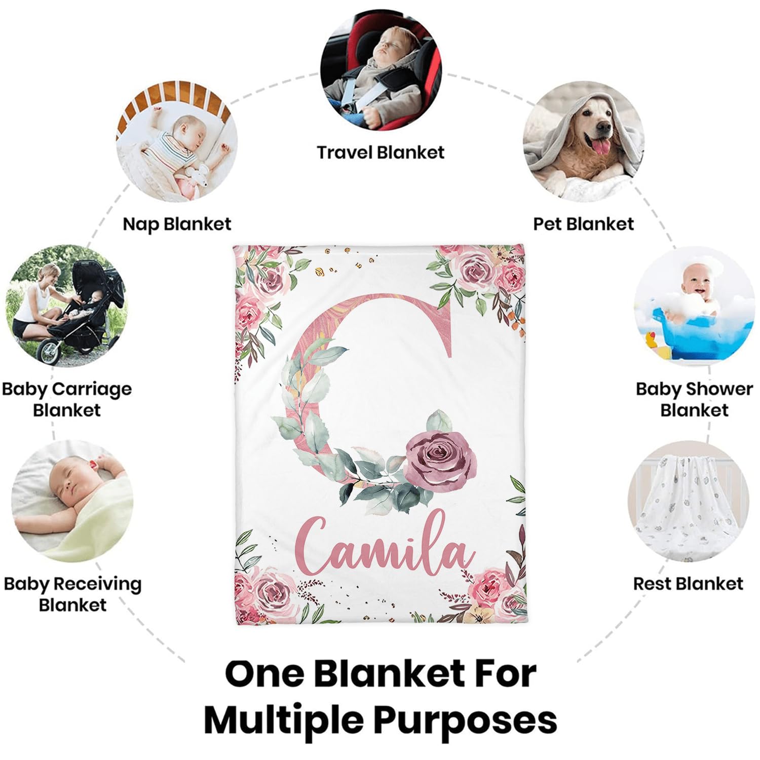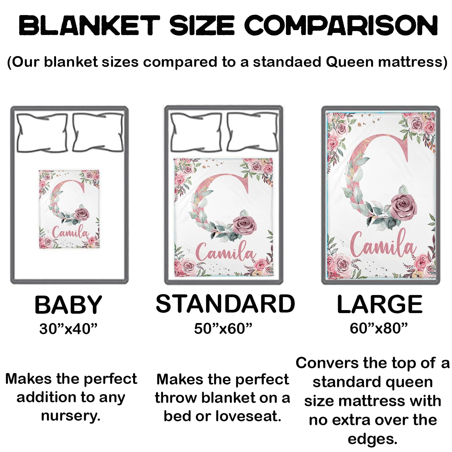Are you looking for a blanket that can keep good memories? This carefully prepared customized blanket with memories is a perfect gift for adults, children, family, friends, pets, mothers, fathers, boyfriends, girlfriends, daughters, sons, grandmothers, grandfathers, wives, husbands, sisters and partners Note: 1. This blanket is printed on one side, and the unprinted side is white; 2. If necessary, we will help you adjust your name to achieve the best results. In order to make the goods reach you faster, when we receive your order, we will immediately arrange production。 If there is any problem with your order, please let us know. Thank you for coming! Personalized Custom Gift Blanket You can add the name (text) you need on the blanket and give it to your baby, family, lover, friend or pet or keep it for yourself. This is a very meaningful gift, we have designed it for you with the fonts and colors you need, it looks great Personalized Gift - newborn gift - birthday gift - kids gift - holiday gift Soft and Light Name Blanket Perfect for babies, adults or pets, this soft and lightweight custom blanket will keep you warm anytime. Can be used as a baby swaddle blanket, crib blanket or baby crawling blanket, can also be your sleeping blanket, sofa blanket, travel blanket, cute prints will not affect the softness of the blanket