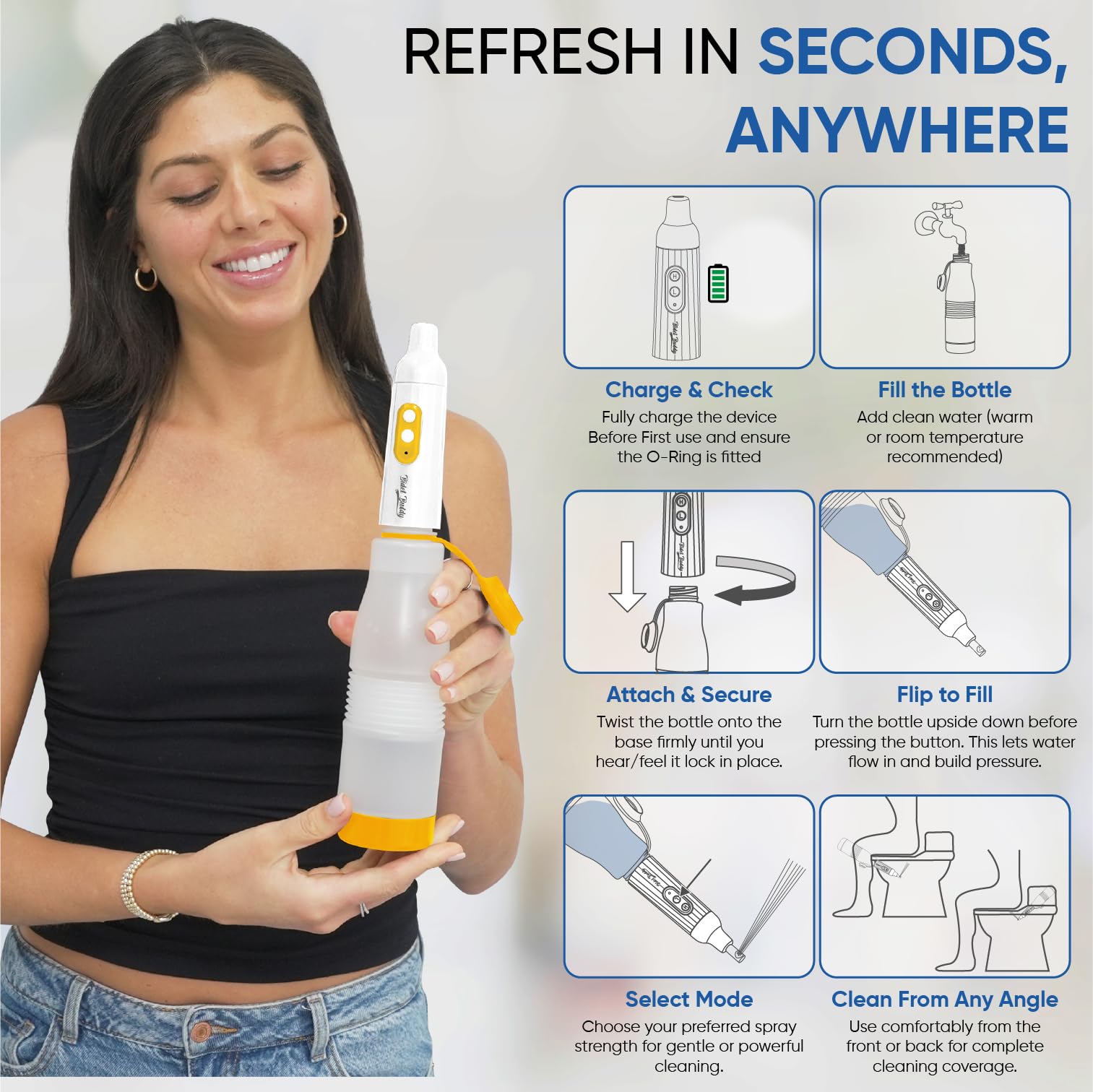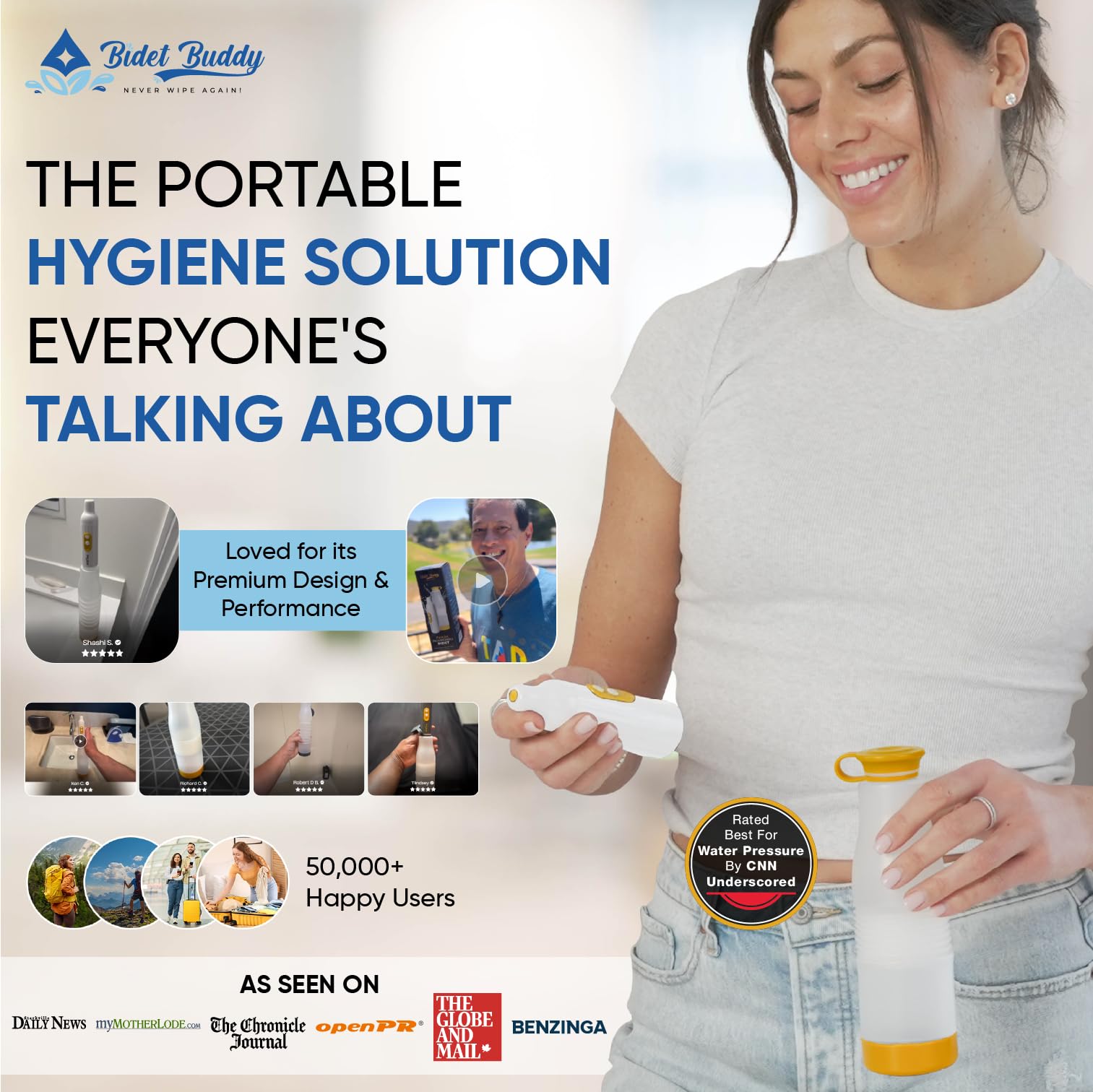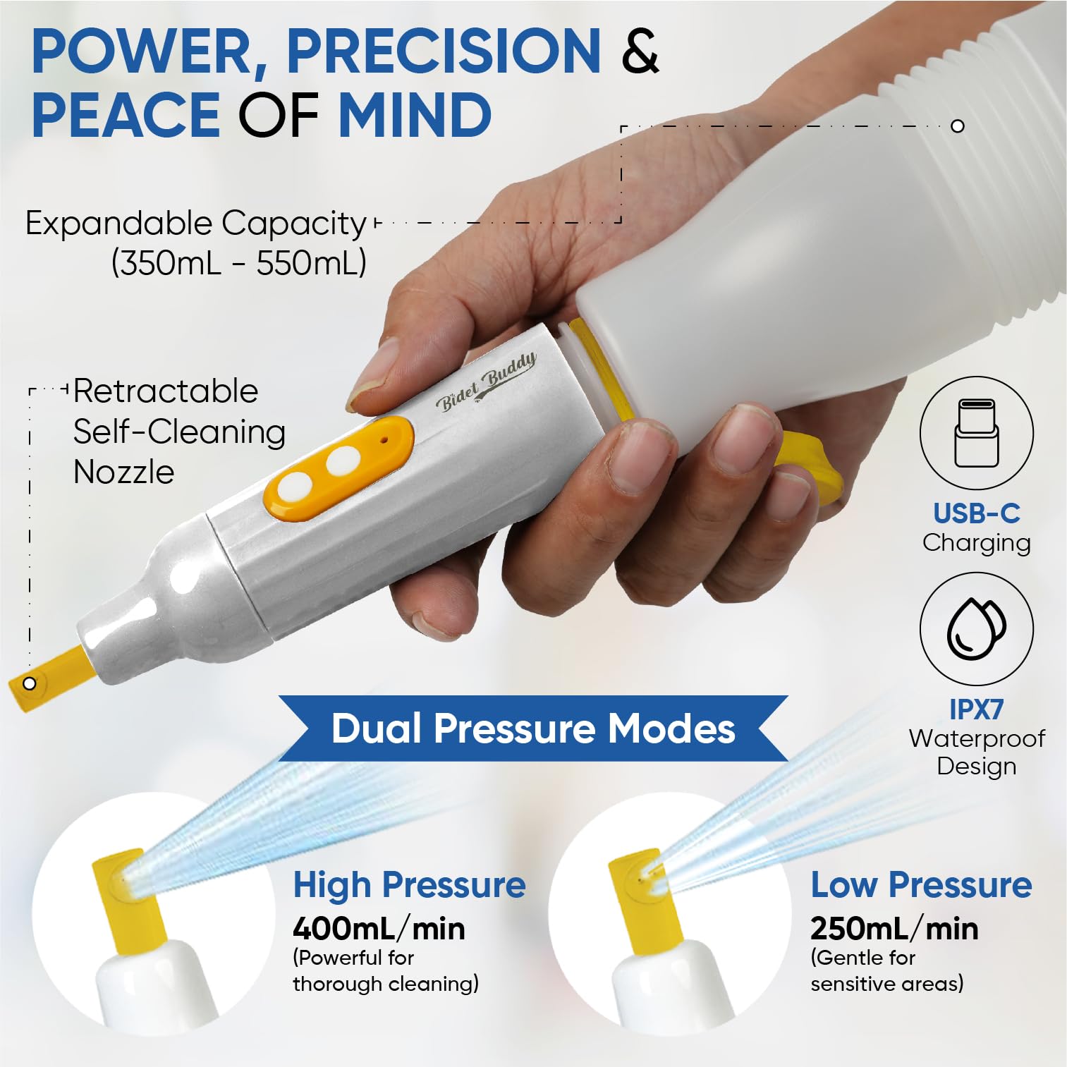 UNRIVALED CAPACITY: Expandable from 350mL to 550mL, the Bidet Buddy PureJet functions as an electric rechargeable bidet bottle. Perfect for travel, postpartum care, and personal hygiene, ensuring extended use without frequent refills. Ideal as a portable bidet for men and women.