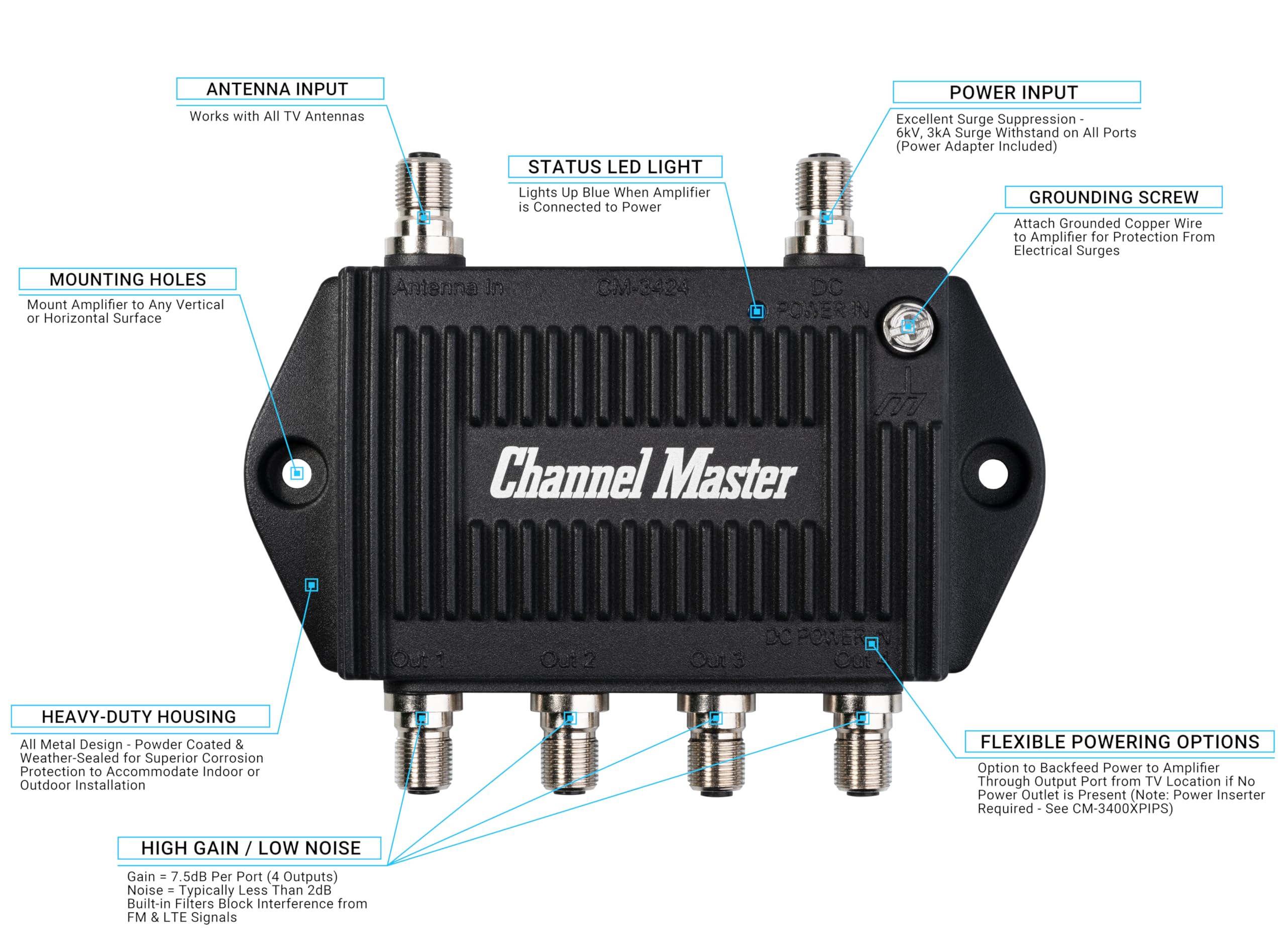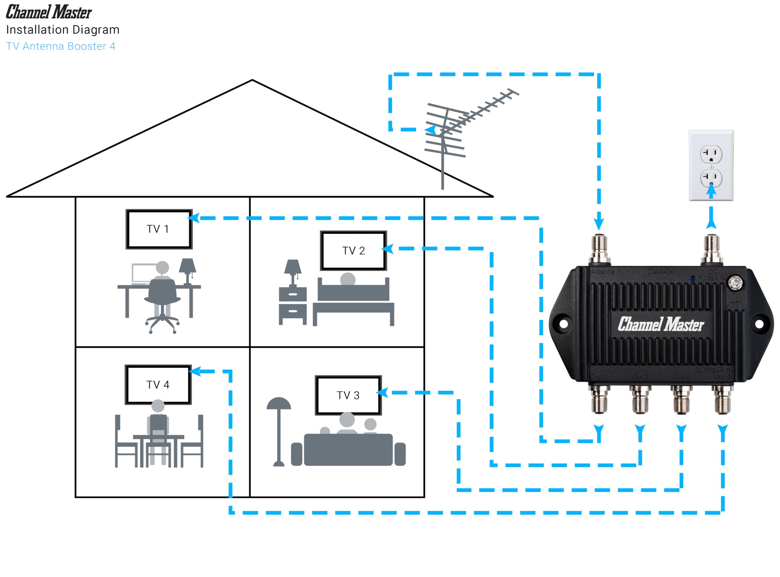 4 Output Ports - Splits TV Antenna Signals to Four Rooms While Boosting Signals. (Replaces standard four-way splitters and improves signal)