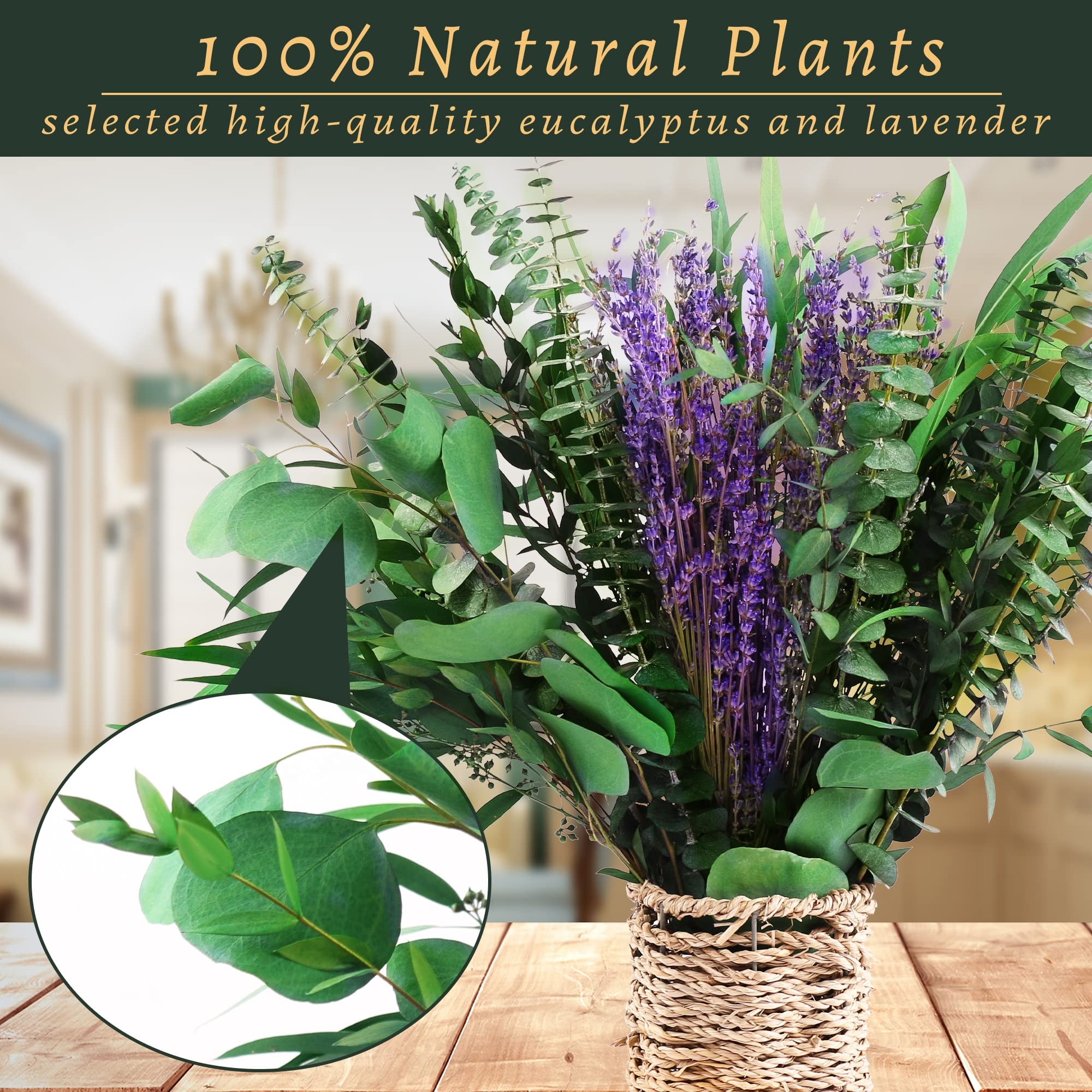 【Selected From Nature】 - All eucalyptus & lavender are selected from nature, no additives, no preservatives, packaged by hand, and remain original smell. The length is 15''~17''. ( Please allow these natural plants a slight difference in size and quantity ). Natural Lavender fragrance is from the seeds, which are so easy to fall off. To keep the charming smell of lavender while not soil your floor, we specially packaged them into organza bag, and we recomend you to hang up the bag directly.