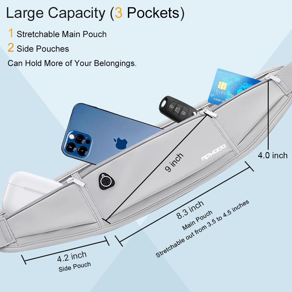 【Large Capacity】The running fanny pack has 3 pockets. The main pouch stretches from 3.5 to 4.5 x 8.3in(HxL), which can hold phones or power bank under 7.5 inches. The 2 side pouches are 4.0 x 3.5in, for holding earphone, keys, cards, cash, tissues, watches, bracelets, etc. The running waist pack is lightweight so you almost cannot feel it when you put it on.