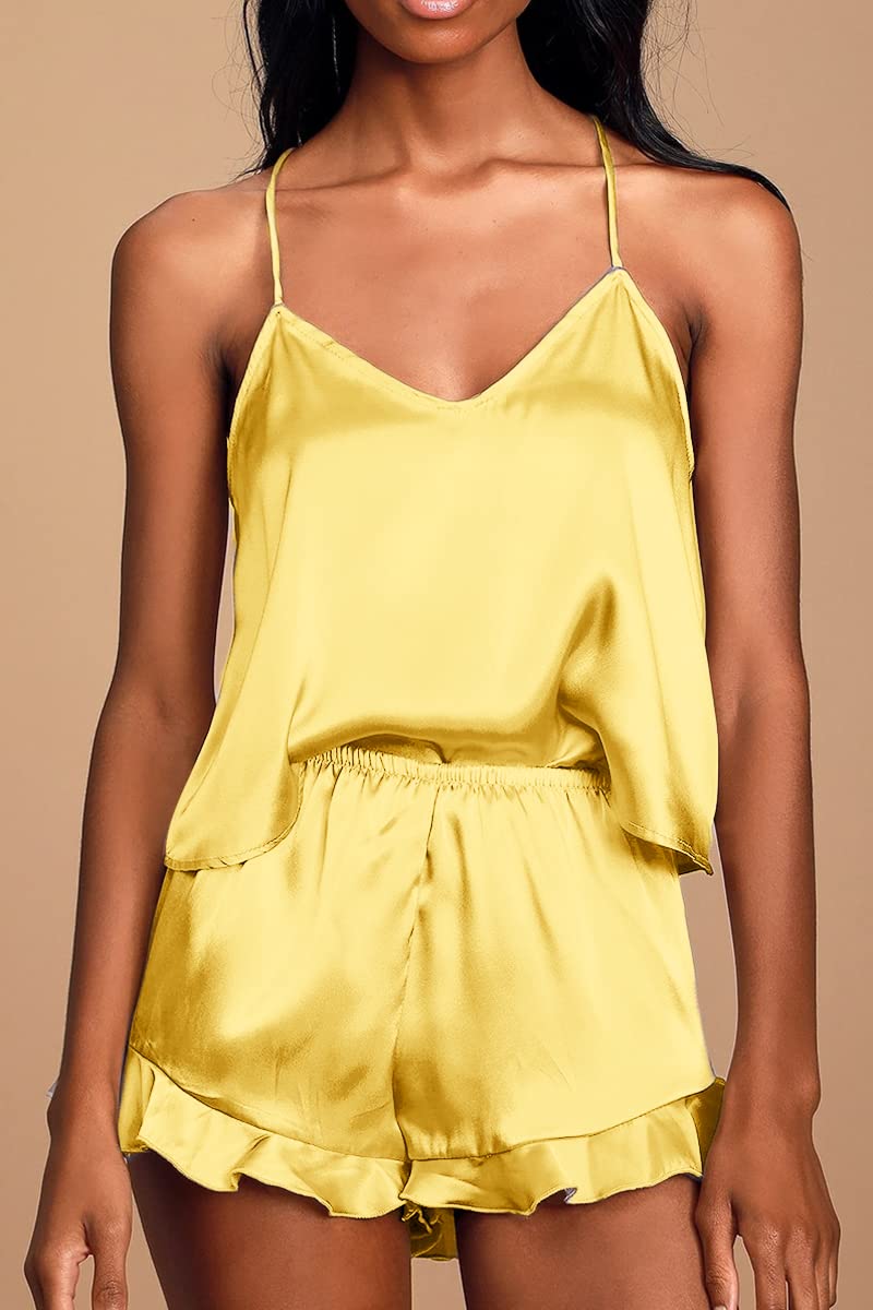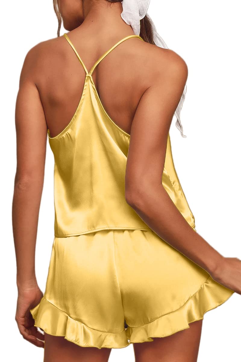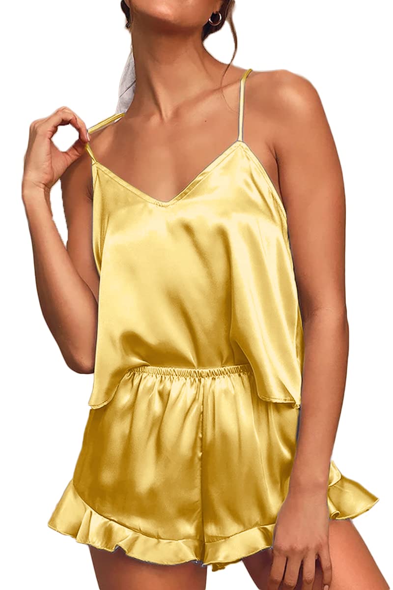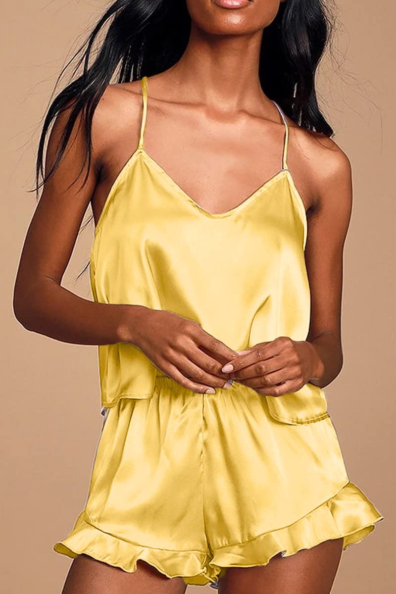 The cute satin silk cami pajamas tops features v neck,low cut,racerback,adjustable straps,the shorts features high waisted,elastic waist,casual loose style.The cute and sexy pajamas sets will make you look more flattering,elegant for your sweet night.