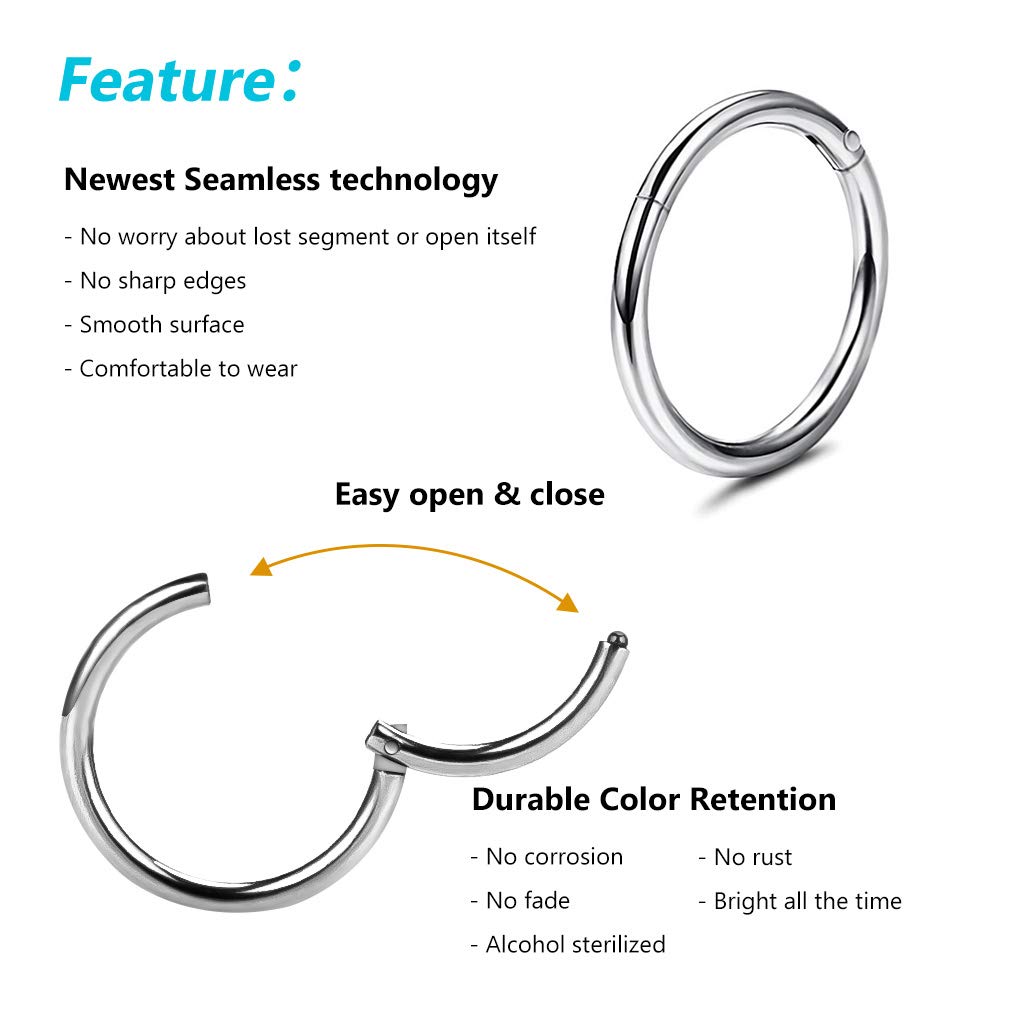 【Newest Seamless technology】The septum clicker made by the upgratest seamless technology,almost undetectable seam and perfect hinged clicker.Easy open,no sharp edges,comfortable to wear and no more worrying about sharp edges hurt your skin or open itself no reason.