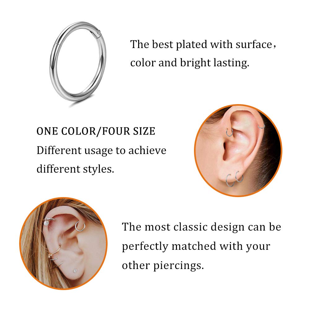 【Various Size with One Color】18G silver 6mm 8mm 10mm 12mm 4 Pcs stainless steel cartilage earrings. One order come with 4 sizes one Color. Various size meet your different need once time. And in this four sizes, you will find the size that suits you best.