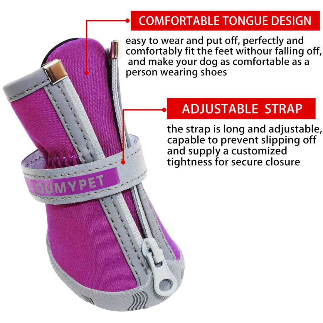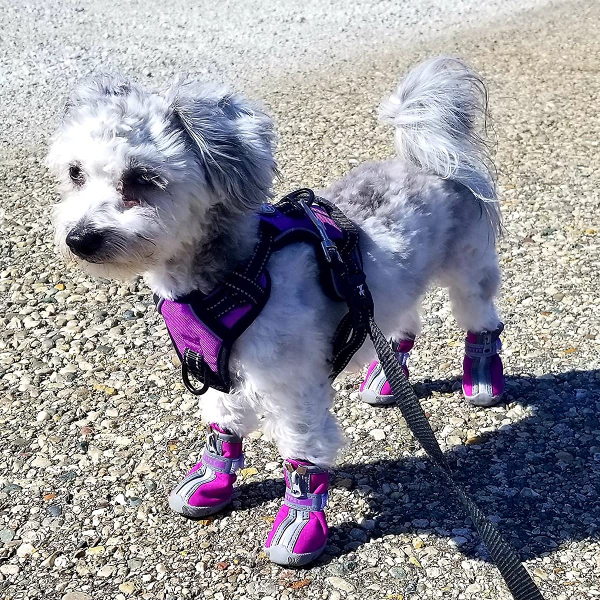 Convenient and Secure: Zip and self-adhesive strap design for manual adjustment, easy to put on / off. These small dog shoes expand with adjustable and reflective straps to ensure a tight fit, also make your puppy safe at night, and easy to find it when it lost