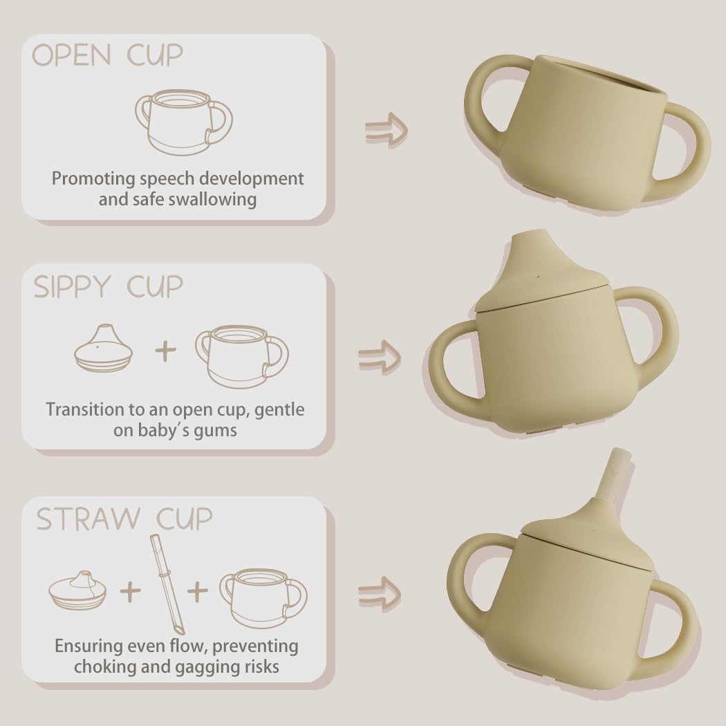 【Three-in-one Design (with straw + spout + open cup)】 Our baby cup features a versatile three-in-one design that can be converted from a sippy cup to a straw cup to an open cup, encouraging your baby to develop drinking skills.The open cup promotes lip closure, speech development, and safe swallowing while also preventing tooth decay. Going from a straw to independent drinking is such a huge milestone for early development, so we have designed one cup that will be there for every step.