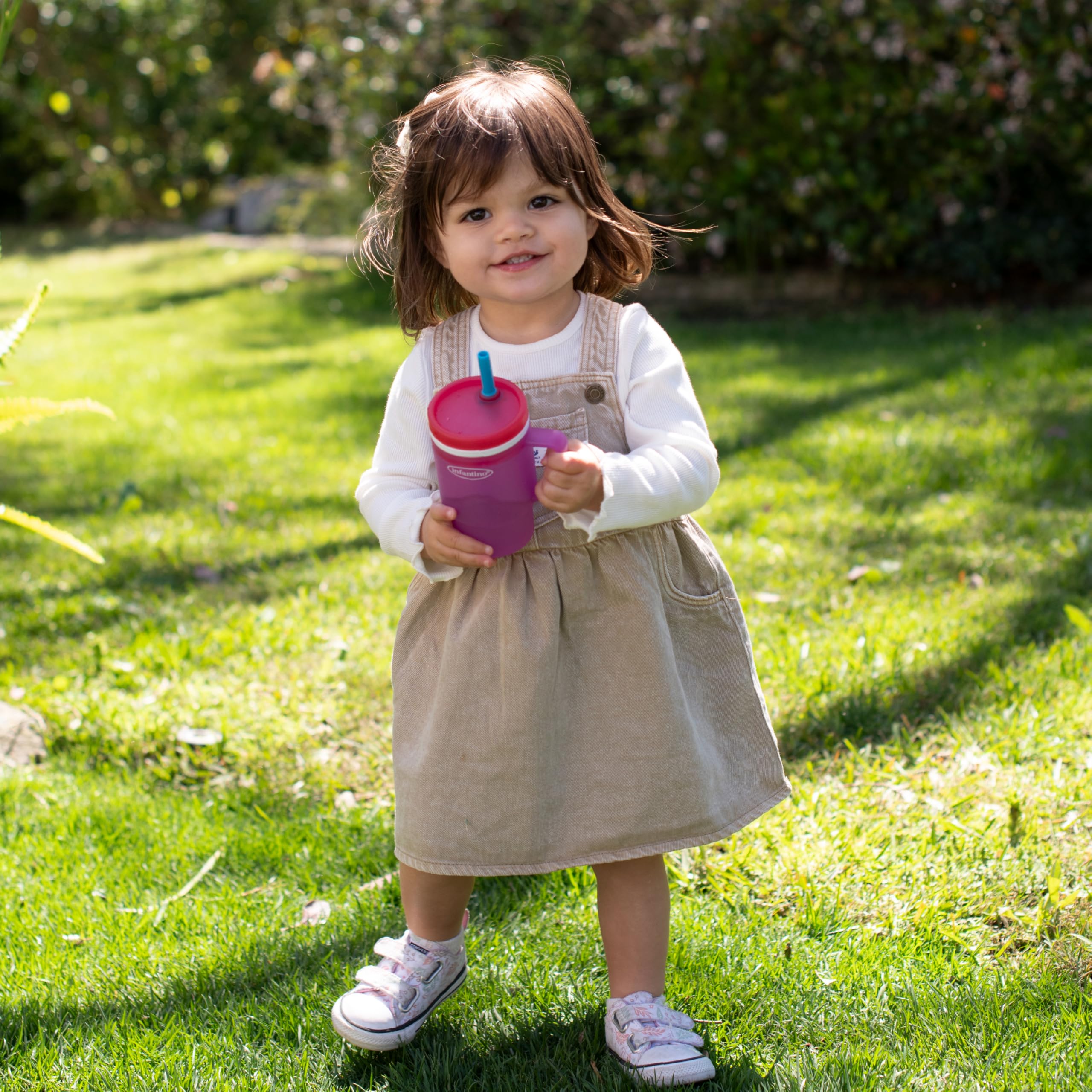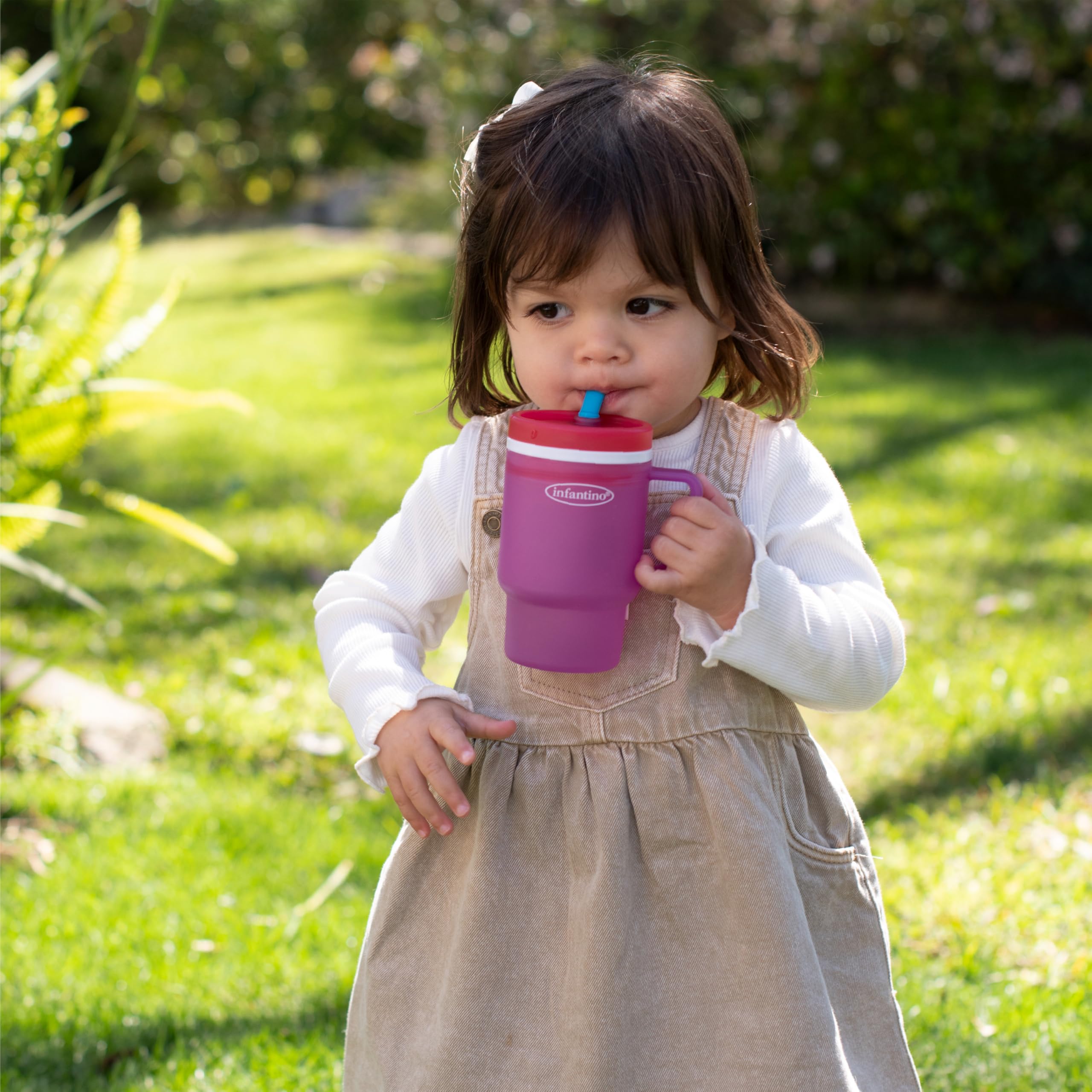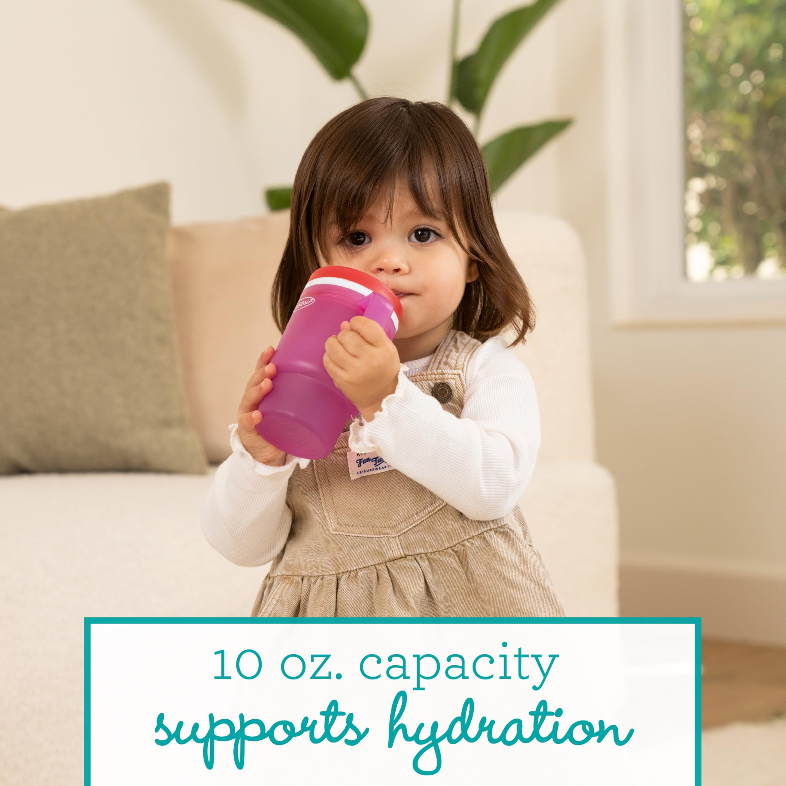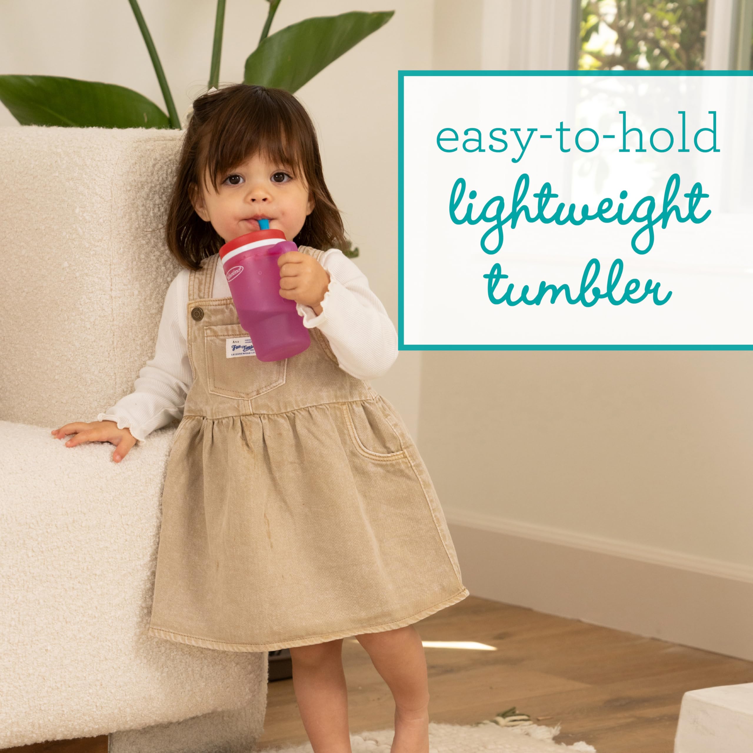 The Infantino My 1st Tumbler is a baby-friendly durable plastic sippy cup that looks just like Mom’s favorite tumbler – only perfectly sized for little hands. With a soft, flexible design and 10oz capacity, it’s made to help babies build sipping skills while feeling just like the grown-ups. Crafted from 100% food-grade, BPA-free plastic, this tumbler features a sturdy handle and a soft straw with an internal valve that allows smooth sipping and helps prevent spills – even when turned upside down. The no-pull-out straw stays secure for baby but comes apart easily for parents to clean. Perfect for water, milk, or juice, this baby tumbler fits most stroller and car seat cup holders and packs easily into a diaper bag. Dishwasher safe and made for everyday use, it’s a stylish, smart essential for keeping little ones hydrated wherever the day takes you.