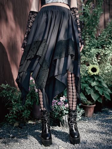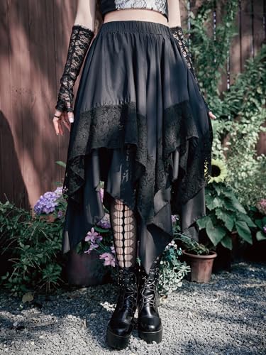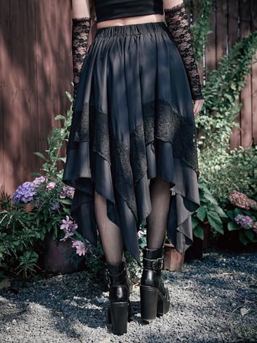 Elastic Waist, Lace Trim, Asymmetrical High Low Hem, A Line, Flowy, Gothic Steampunk Skirt, Casual Midi Skirt