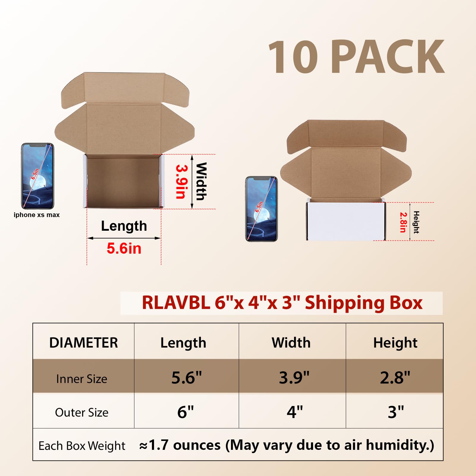 DIMENSION: The shipping boxes set includes 10 packs of the cardboard box. The outer size of this medium mailer box is 6” x 4” x 3”(L x W x H), the inner size is 5.6" x 3.9" x 2.8". Suitable for packing or mailing those small and lightweight items.