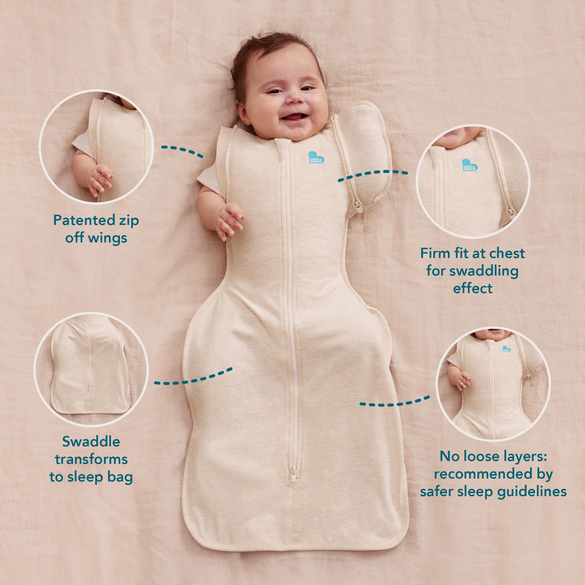 Love To Dream Swaddle UP Transition Bag Once your baby starts to show signs of rolling, it's time to stop swaddling and transition them to arms free sleep. Our unique Swaddle Up Transition Bag is an easy way manage this change, while helping to maintain an established sleep routine. Specially designed to provide the secure feeling of a swaddle, while the zip-off wings allow a gentler and gradual move to arms-free sleeping. Designed to Preserve Sleep Routine & Keeps Baby Settled Our uniquely designed zip-off wings allow for one arm to be free & the other swaddled, maintaining that familiar swaddled feeling. After a few nights, simply remove the remaining wing so both arms are free. This is an easy way to achieving arms free sleep while helping to preserve an established sleep routine. Once both wings are removed, continue to use as a sleeping bag providing the snug feeling baby is used to for longer-lasting use. Arms-Free also allows older babies to push up or reposition when they roll over. Easy to Use, Hip-Friendly Design Our Swaddle UP Transition Bag is designed to provide ample room for baby's legs and hips to move naturally, allowing for healthy hip development. The clever two-way zipper mechanism means quick and easy diaper changes for any parent, grandparent or carer, even in the middle of the night. The light, super soft and stretchy fabric is ideal for warm room temperatures between 75°F & 81°F. Fabric content: 97% Cotton 3% Elastane. From the unique original Swaddle Up, to bedding and Self-Soothing Toys, the Love To Dream range has grown to provide a portfolio of sleep solutions designed for children up to four years old.