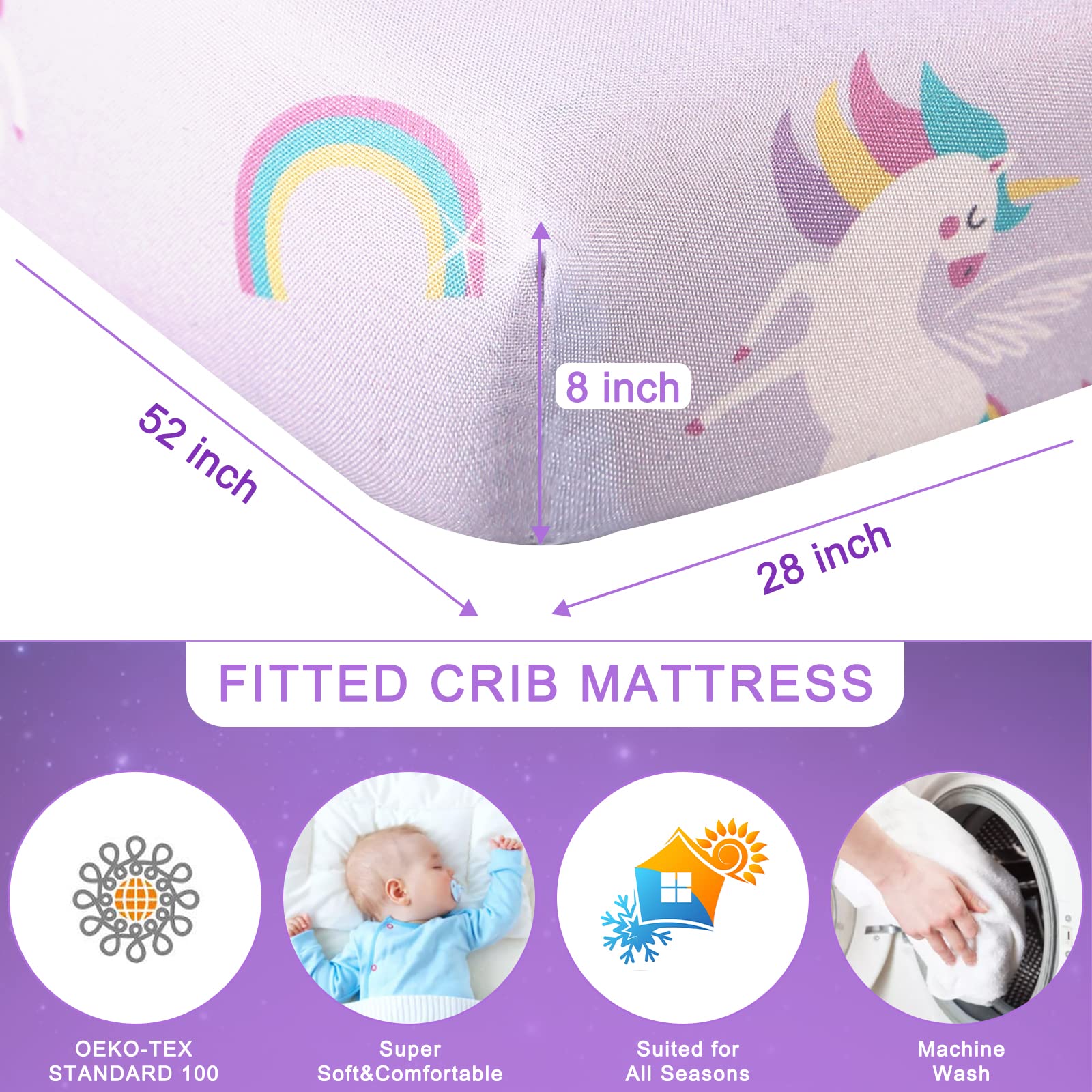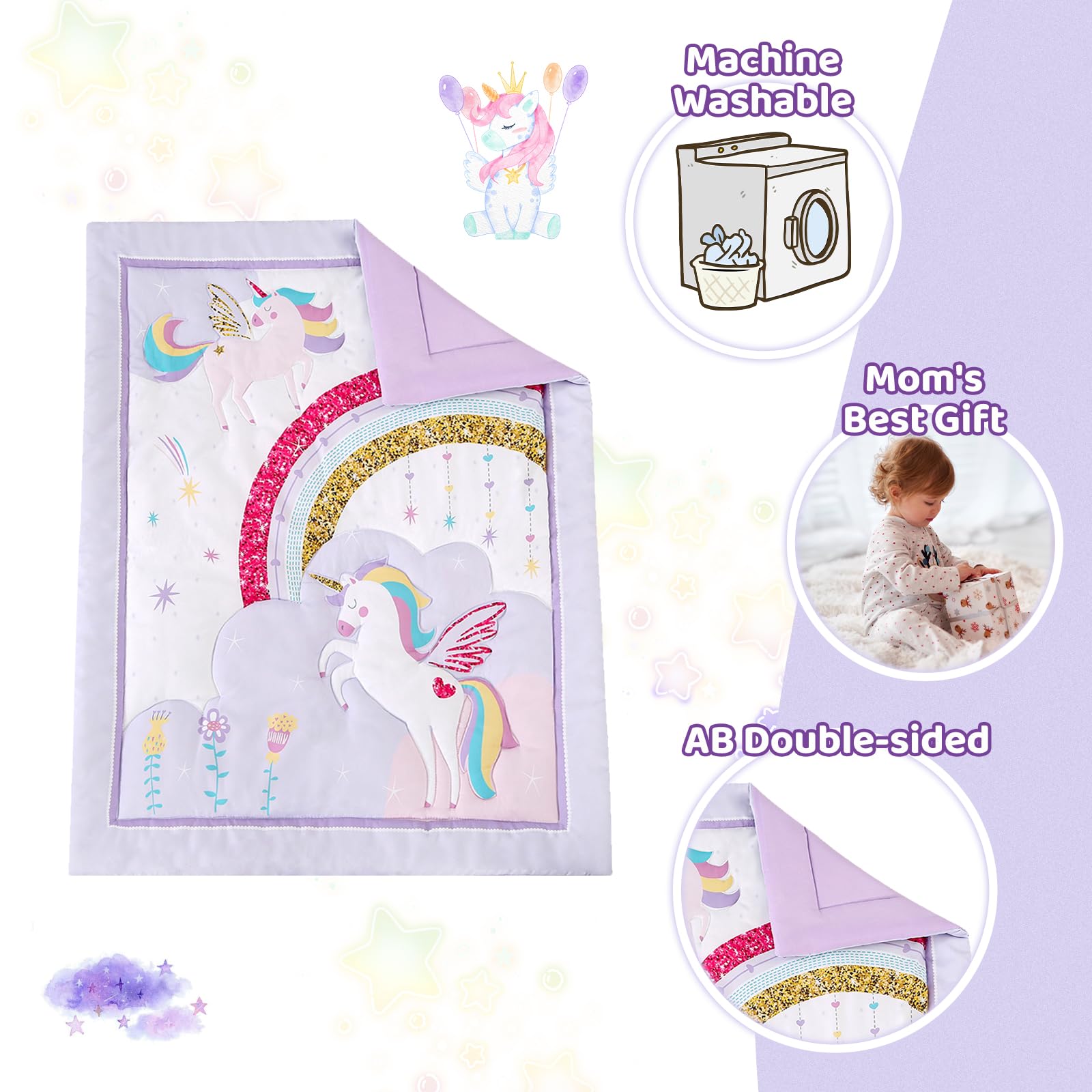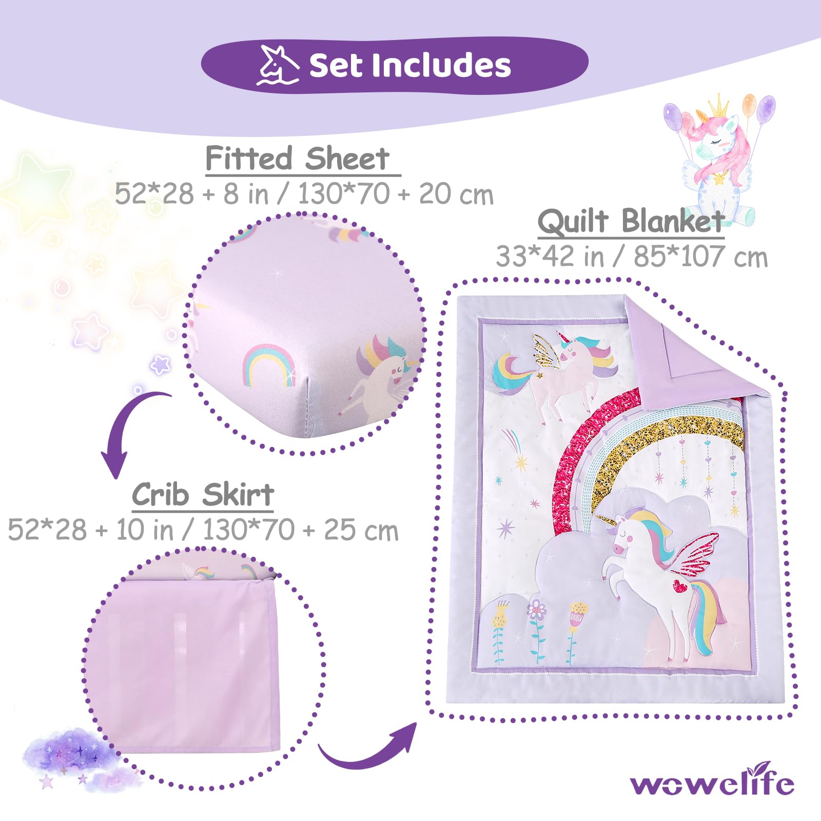 Theme: Purple baby bedding crib sets girl features adorable unicorns, whimsical rainbows, and cascading stars. It create a dreamy bedroom, bringing more color and warmth to life. You will find your baby getting a restful sleep