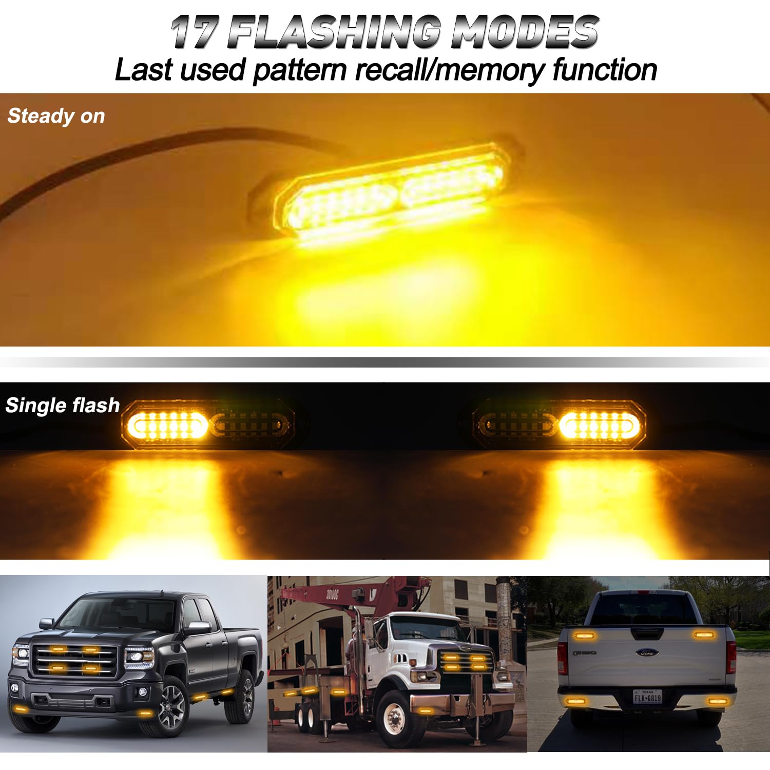 【17 FLASHING MODES】Built in flasher, and the last used pattern recall/memory function. 17 select-able flashing patterns, including Steady on, Single flash, Double flash, etc.