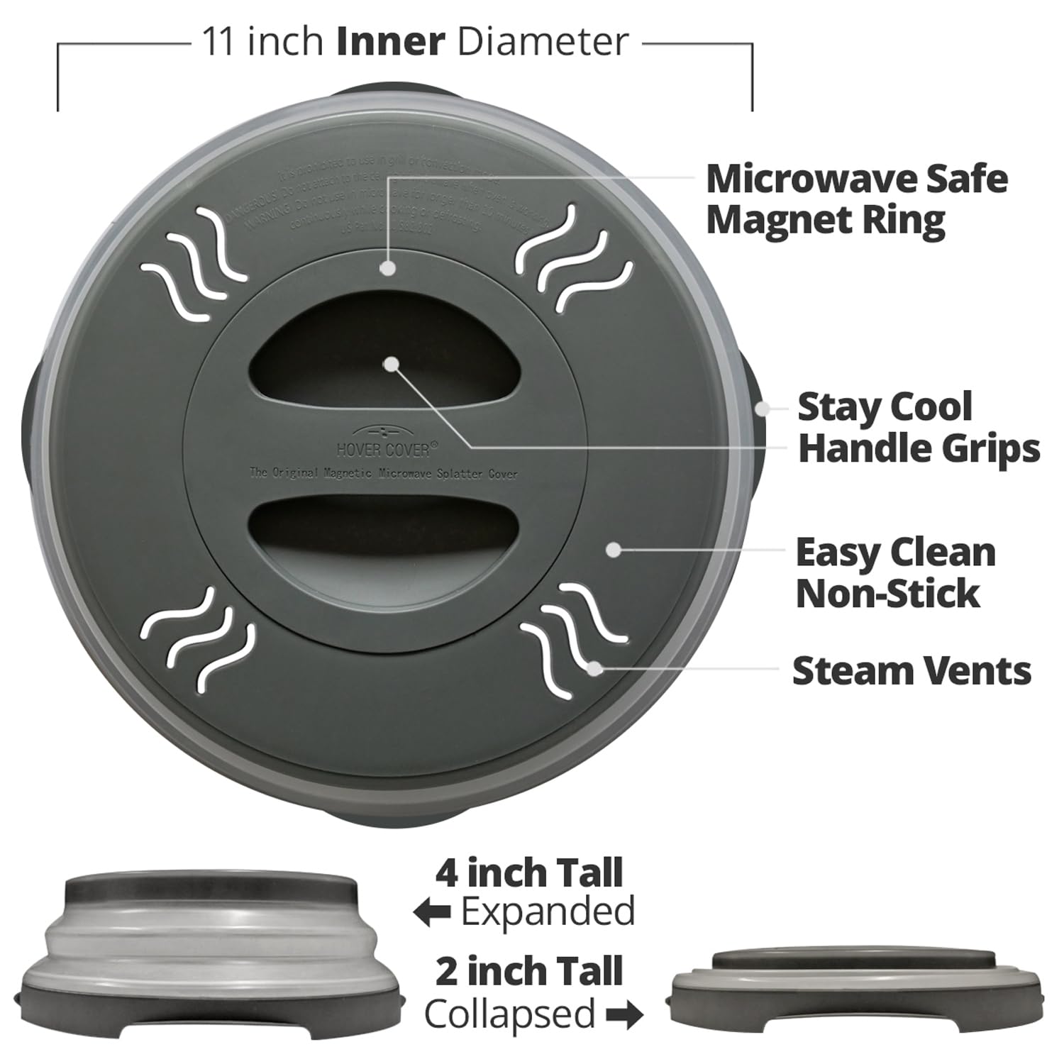 COLLAPSIBLE & MAGNETIC STORAGE: The HOVER COVER 2.0 Microwave Splatter Cover measures 12 x 12 x 4.00 inches and features New Higher Power microwave-safe magnets that securely attach to the microwave ceiling for convenient, space-saving storage. It easily expands to fit tall bowls or shallow plates, providing optimal coverage for mess-free heating.