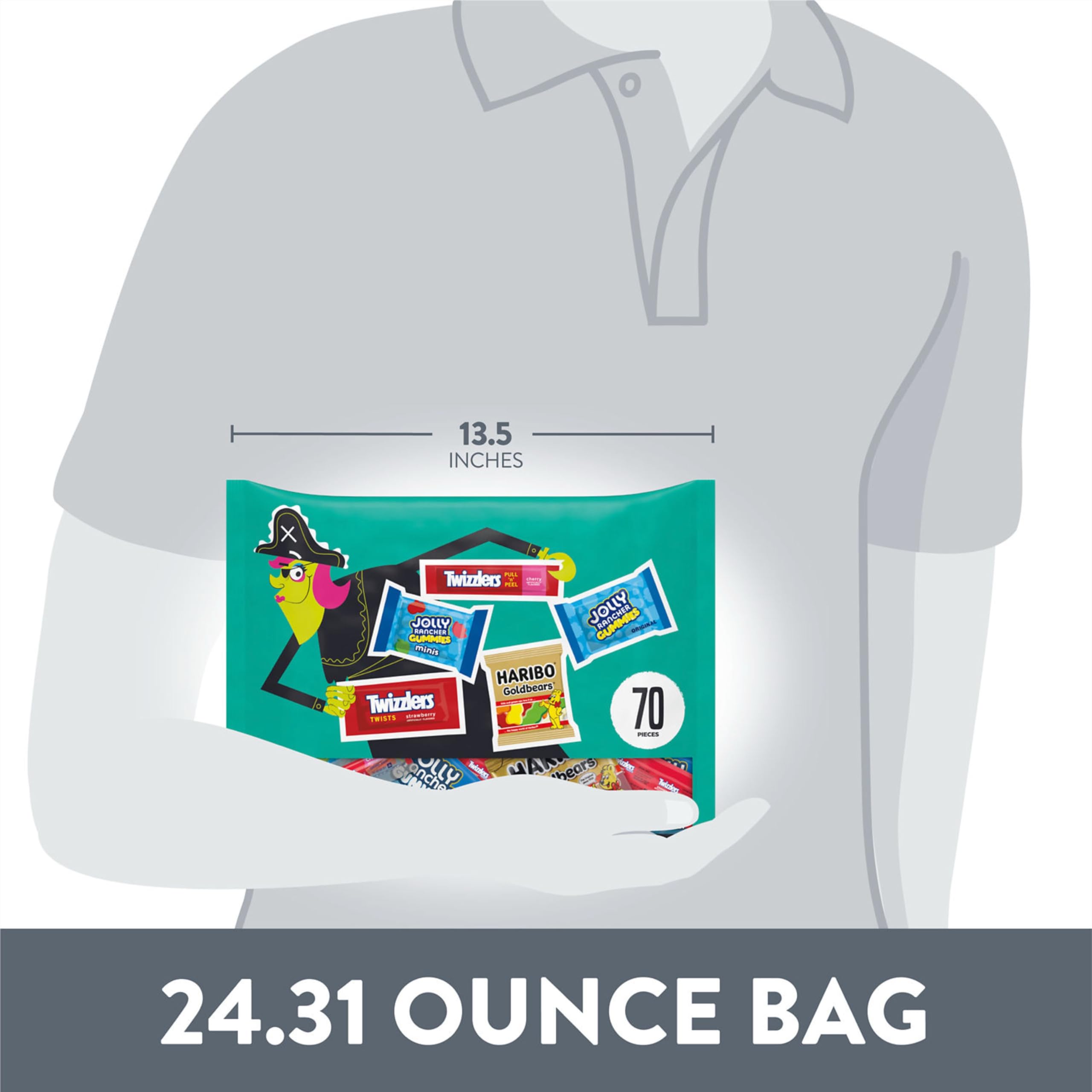 Contains one (1) 24.31-ounce, 70-piece variety bag of HARIBO, JOLLY RANCHER and TWIZZLERS Assorted Fruit Flavored Candy