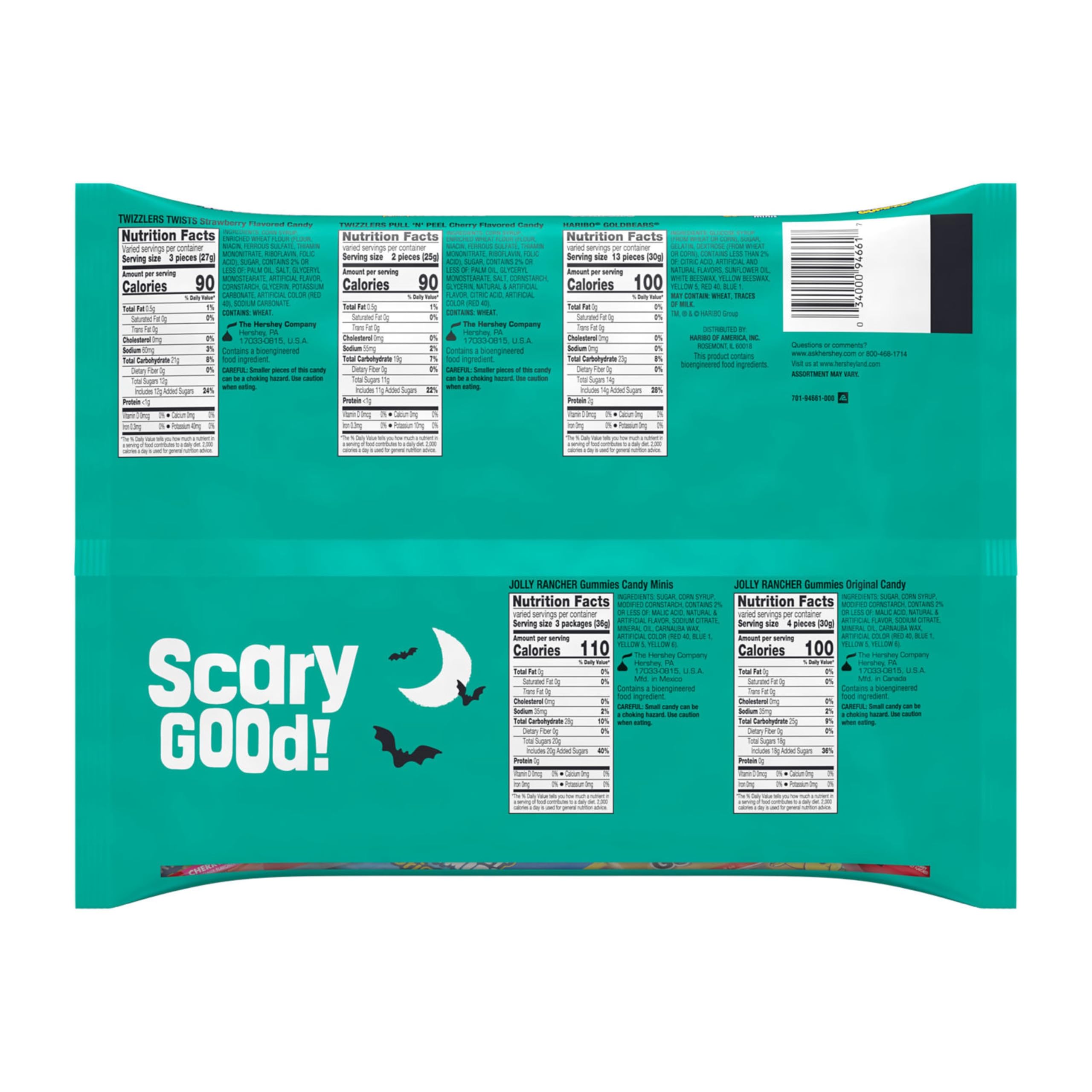 Includes HARIBO GOLDBEARS gummies, JOLLY RANCHER gummies candy, JOLLY RANCHER gummies minis candy, TWIZZLERS Twists strawberry flavored candy and TWIZZLERS PULL 'N' PEEL cherry flavored chewy candy