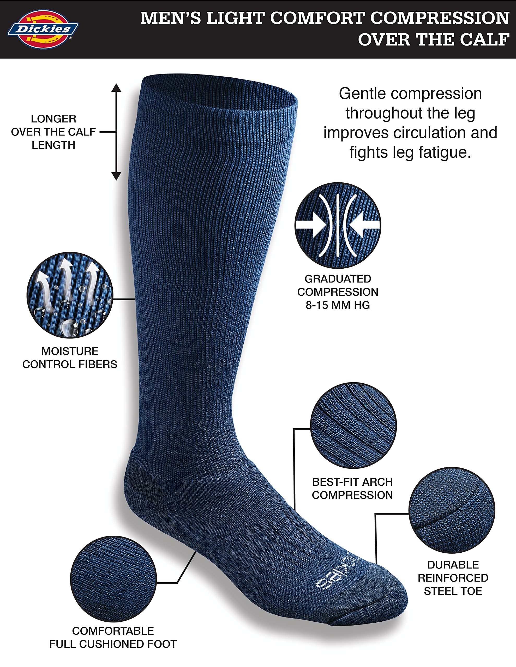 Description Dickies light weight comfort compression socks for men circulation is engineered with gentle mild compression throughout the leg to improve circulation and fight leg fatigue. Compression socks are not too tight or hard to get it on and fit well, these socks are mild compression grade between 8~15mmHg. Over the calf compression socks constructed with moisture control fibers, compression sock help improve performance, fast recovery, increase blood circulation and reduce fatigue. Perfect for long flight travel, long hour shifts, teachers, and seniors. For Over 95 Years Dickies has been making hard-duty work products built to stand up to whatever life throws at you. Dickies Work Socks are built with purpose to deliver superior comfort and performance on and off the job.