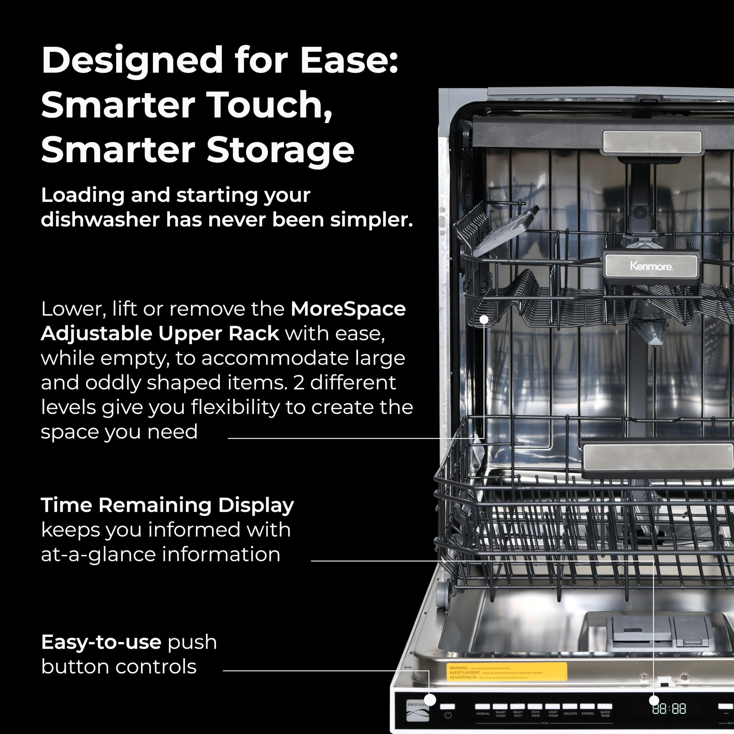 Tackle tough messes with the Kenmore 24" Built-In Dishwasher. UltraWash Plus uses 3 pressurized spray arms and filtered water for a powerful clean without pre-rinsing. The SmartWash cycle senses soil levels and adjusts settings automatically. Know it's good and clean with the UL Certified Sani Rinse Option. TurboDry combines a fan and heating element for dry, spot-free dishes. Fit up to 15 place settings with a flexible adjustable rack. Quiet Wash keeps things peaceful, while ENERGY STAR certification helps save water and energy. Built-in leak detection protects your home from water damage.