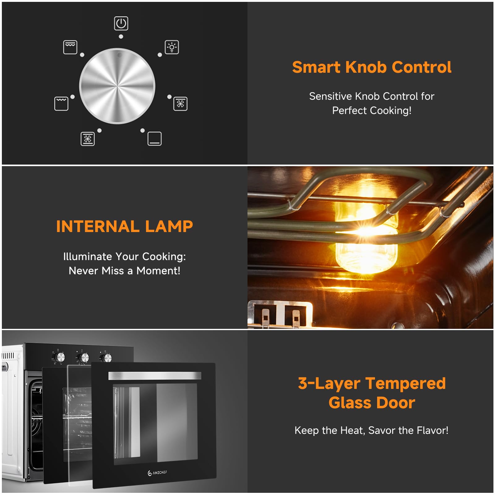 [STYLISH SINGLE WALL OVEN] This electric wall oven features a sleek, black glass design that adds a touch of contemporary elegance to any kitchen. It effortlessly complements various decor styles. The built-in halogen light provides a warm glow, allowing you to easily see inside the oven through the sturdy three-layer glass door. This thoughtful design helps you focus on preparing fresh ingredients without the risk of burns. With this oven, you can confidently create delicious dishes, achieving exceptional flavors and textures every time.