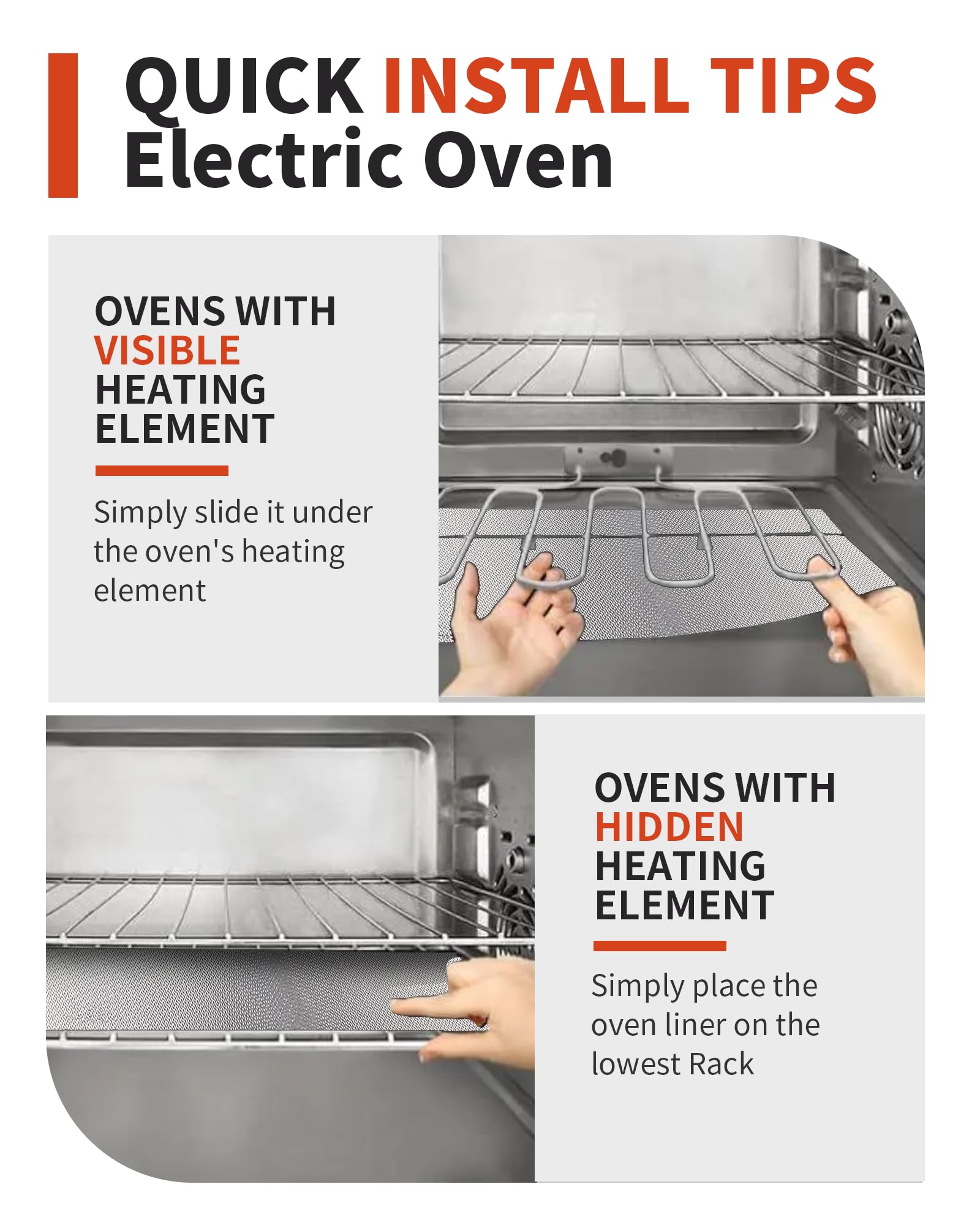 Works with All Setups – Compatible with ovens with hidden or exposed heating elements. For hidden elements, place on lowest rack; for exposed, use below burner trays.