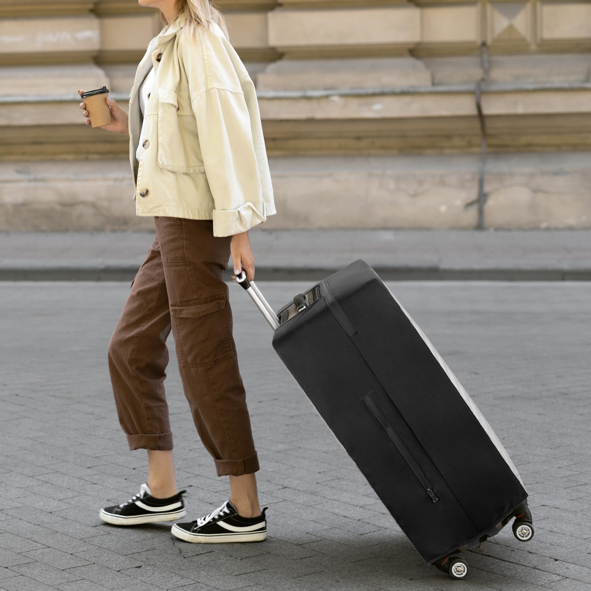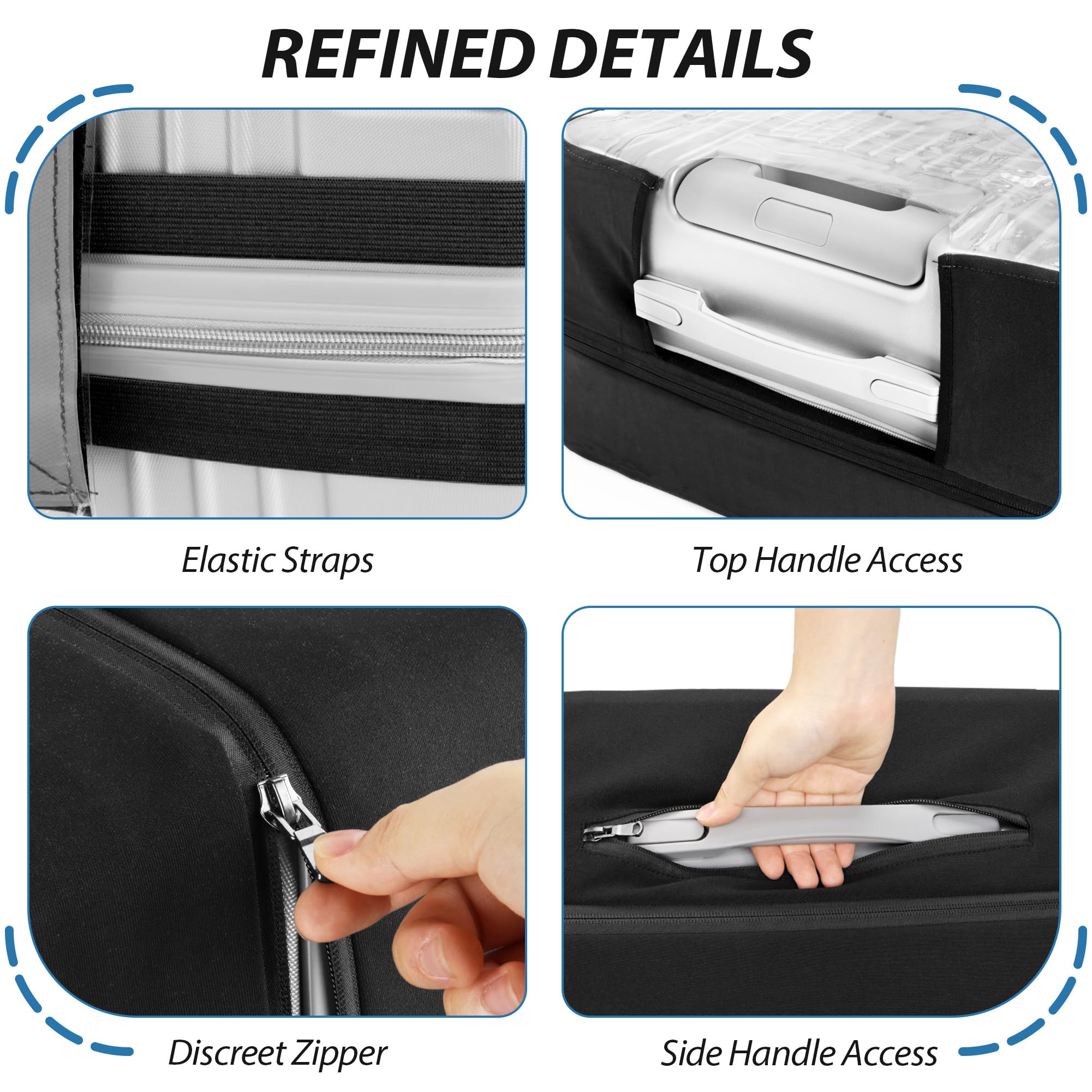 Thoughtful Design Details: Every aspect of this luggage cover protector is crafted for convenience and a perfect fit. It features a long, smooth-gliding side zipper that allows full access to your suitcase without removal. Strategically placed openings on the top and sides provide easy access to the handle and levers. An elasticated hem at the bottom securely wraps around the wheels, ensuring the protector stays snugly in place.