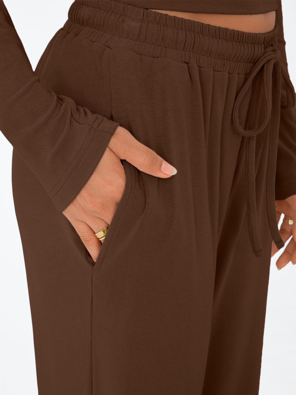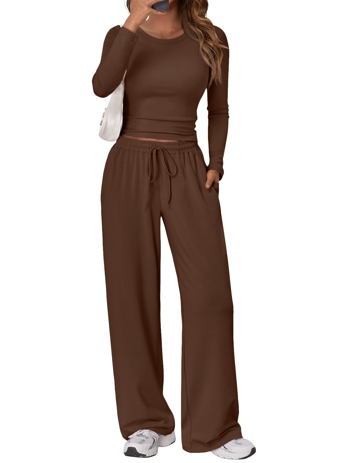 Design & Style: With a sleek crop top and wide-leg pants, this set is designed for those who love a mix of style and relaxation. The side ruching adds a touch of elegance, while the drawstring waist on the pants guarantees a comfortable fit that moves with you.
