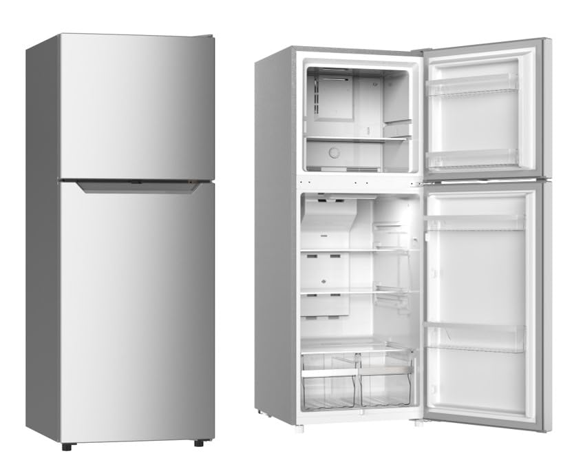 Our modern 10 cu. Ft. Refrigerator has a 2 Reversible doors configuration with a freezer compartment on top and a fridge compartment at the bottom. Featuring an adjustable thermostat, a built in lamp, a slide out shelf and adjustable feet, This CFC free unit will allow you to easily store your snacks and beverages to keep them fresh at all time.