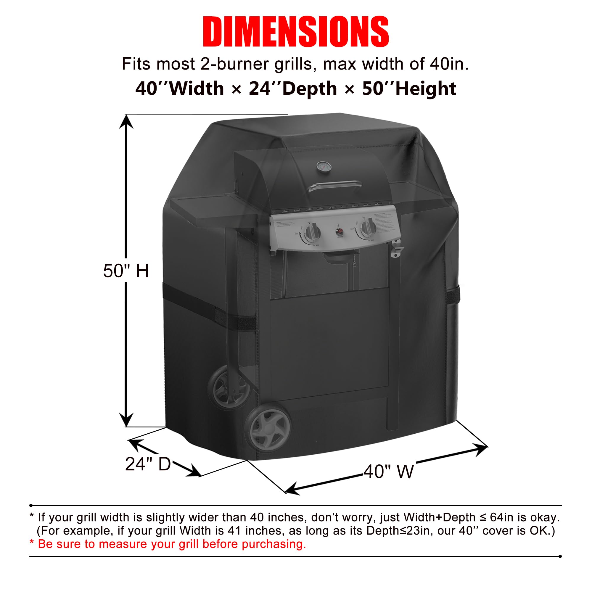 [Dimensions] W x D x H: 40 inch x 24 inch x 50 inch, fits most 2-burner grills up to 40'' wide. If your grill width is slightly wider than 40 inches (within 42''), it's okay as long as the width plus depth is less than or equal to 64 inches. The choice of grill cover depends on the size of your grill, please make sure to measure your grill before purchasing. If you are unsure which size of bbq cover is suitable for your grill, please contact us with the size of your grill.