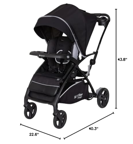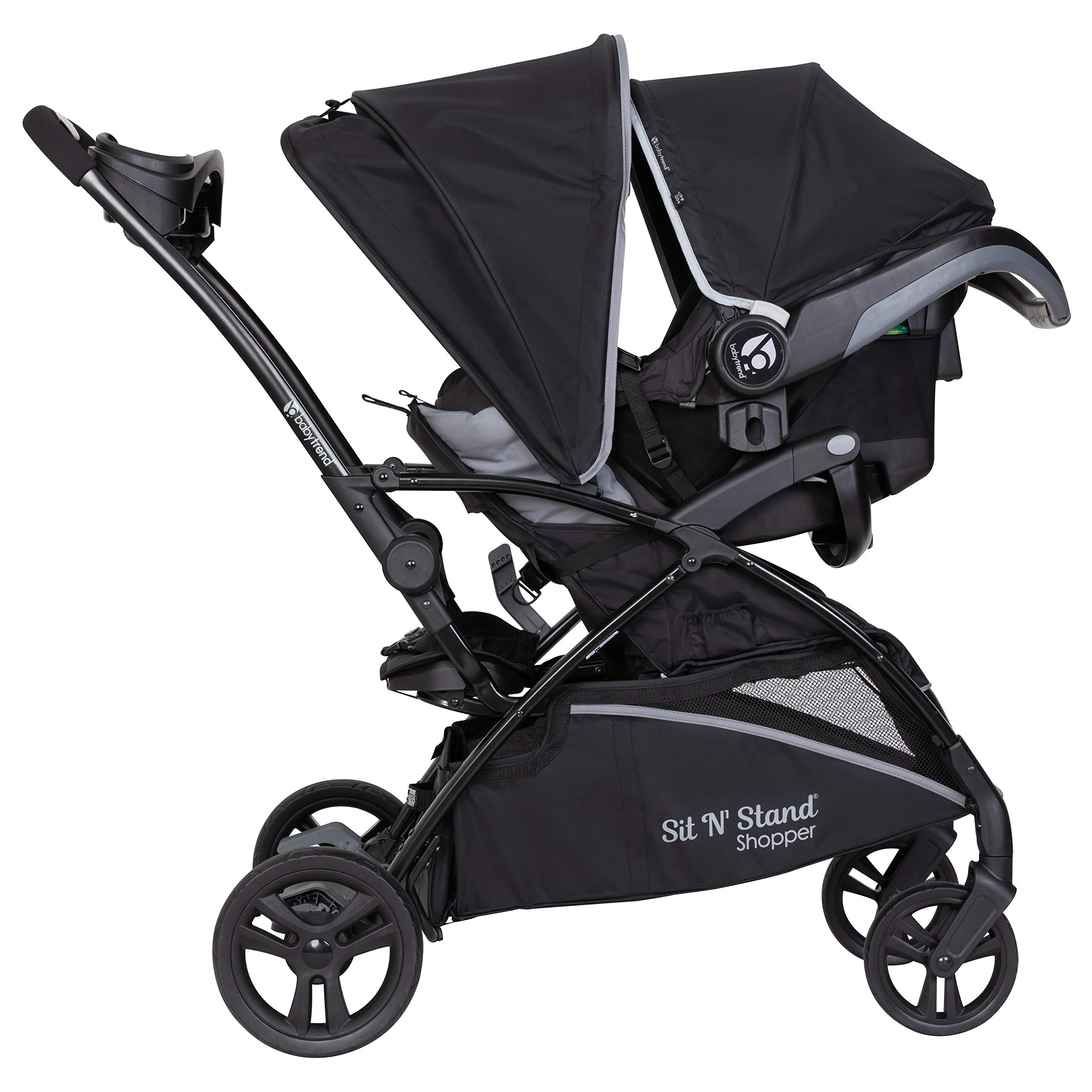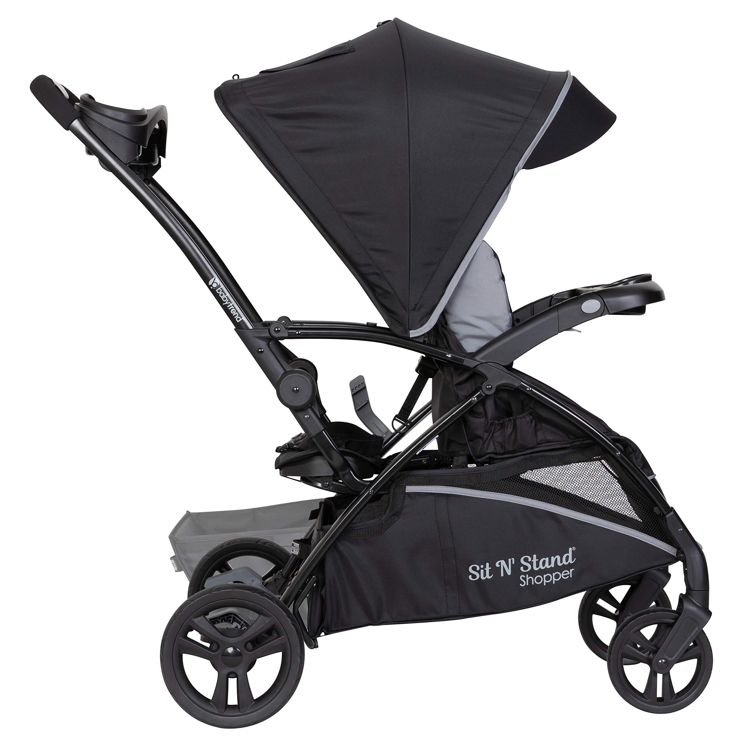 The Baby Trend® Sit N’ Stand® 5-in-1 Shopper Stroller is perfect for your growing family. With the new compact and streamlined frame, our Sit N’ Stand® 5-in-1 Shopper Stroller has 5 modes of use – travel system mode, car seat in the front seat and older child standing on platform, child in the stroller seat only, child in the stroller seat with sibling sitting on bench, and child in the stroller seat with sibling standing. The front and back seats can hold kids up to 50lbs each. Strolling with our Sit N’ Stand® Shopper Stroller will be a breeze for you and your little ones. Your children will appreciate Comfort Cabin, which includes removable extra-long canopy with UPF 50+ protection, multi-position reclining seat, deluxe fabrics and premium padding that will keep them safe and comfy, staying away from the harmful sun rays. Parents will love our Parent Premiums that have a modern parent console with multi-directional cell phone positioner and extra-deep cup holders. Mom and dad now can easily access the large storage basket in the front and back. With the innovative MagneTec™ Basket, parents can open and close the basket very quickly with the help of strong magnets to hold the basket closed. This practical extra-large basket can be extended and hold up to 30lbs of parents’ essentials – groceries, toys, diaper bags, etc.