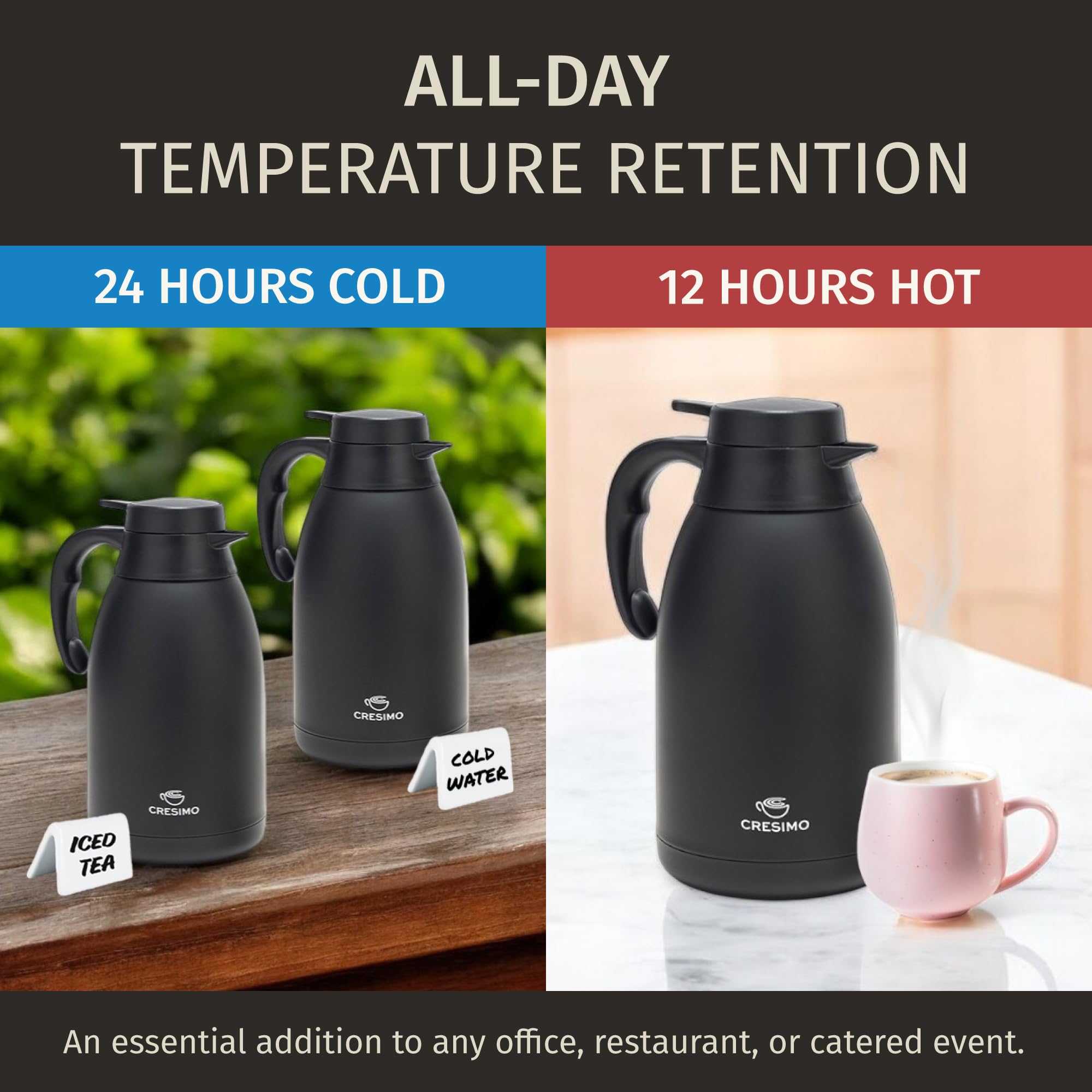 Enjoy Your Coffee the Way You Like It! Nothing makes it easier to wake up in those early mornings, than having fresh, aromatic, and piping hot coffee ready to drink! With our premium Cresimo hot drink dispenser, you can enjoy hot drinks anytime and anywhere. The vacuum insulation technology locks in the temperature and preserves the flavors you love and the freshness you need! The durable double-walled 18/8 stainless steel interior and exterior was crafted with style and functionality in mind - keeping your kitchen sleek and your beverages hot for 12 hours and cold for 36! For best results, preheat your thermo for hot drinks by adding hot boiling water inside for 15 minutes and then dumping it out, before adding your hot beverage. Not only will this premium coffee thermo keep your beverages hot for 12 hours, but the outer body stays cool to the touch when filled with hot liquids! Plus, the exterior remains condensation-free when filling it with cold beverages. This large 68 ounce size holds up to 2 Liters of Coffee. Perfect for serving fresh, hot coffee throughout the day in your home, office, or on the go. This insulated carafe is also great for hosting events - weekend brunch, holiday parties with a hot chocolate station, book club get togethers, and so much more. This is a must have kitchen accessory for coffee lovers. Upgrade your coffee experience today with your very own insulated coffee carafe.