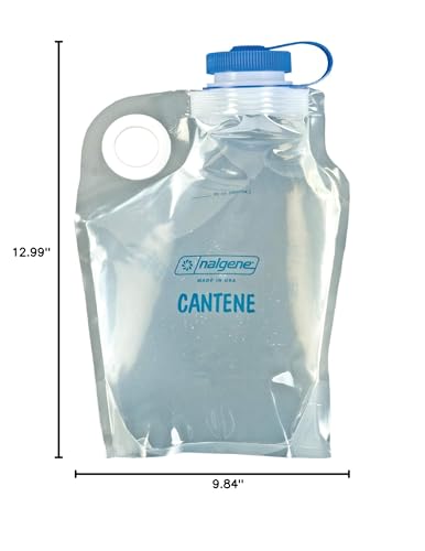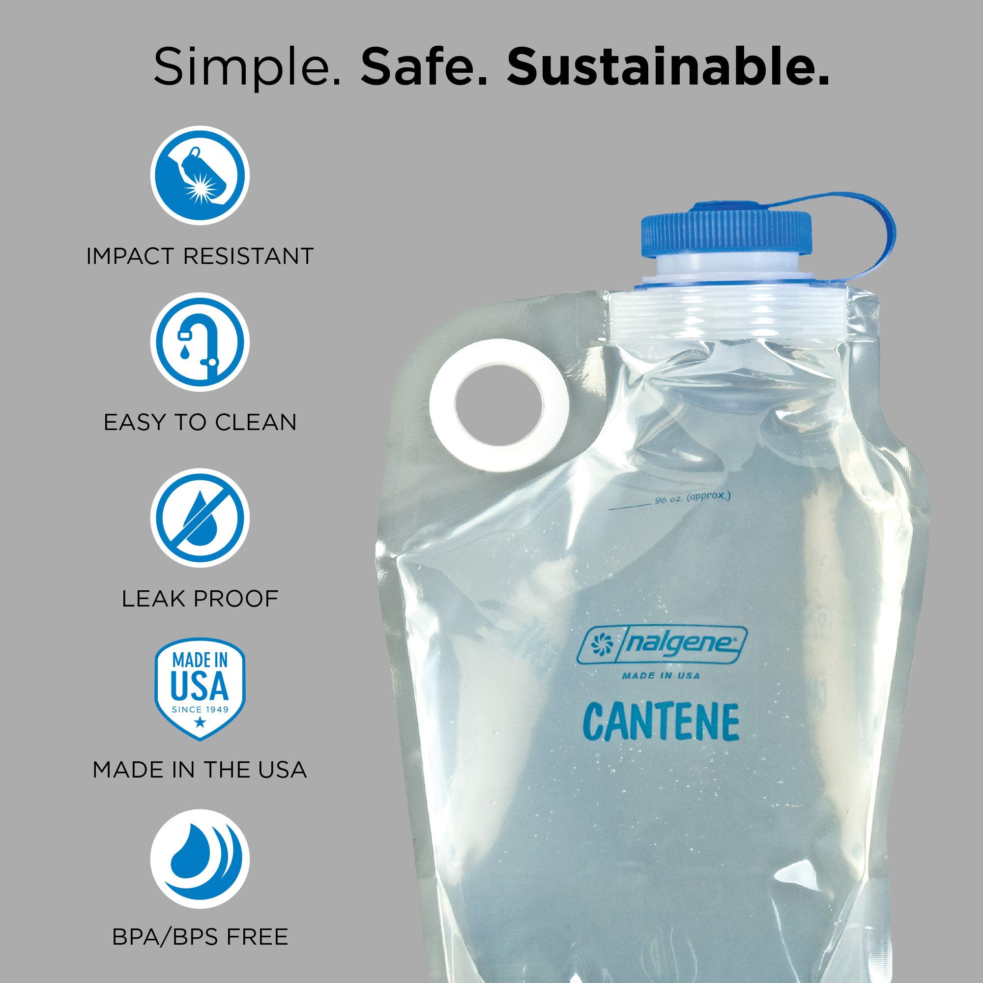 Amazon.com The Wide-Mouth Cantene, from renowned personal hydration company Nalgene, is made of multilayered material that offers stiffness and strength for stand-up capability, yet is soft and flexible to be folded or rolled when empty. The wide opening accepts ice cubes and provides easy access for cleaning, and also accommodates all major water filters. A guaranteed leakproof system and loop-top cap offer reliability and versatility, and a gusseted bottom stands upright. Features Sturdy and reliable Made with unique multi-layer film Collapsible and flexible Dishwasher safe on the top rack Withstands temperatures from -20 to 220 degrees Fahrenheit Gusseted bottom allows Cantene to stand when full Loop-top cap Made in the USA Anatomy of a Nalgene Bottle Threads: Nalgene bottles and caps feature continuous, straight shouldered semi-buttress threads for increased contact area on the surface. This allows for greater tightening force without stripping threads. Cap: Durable caps are designed and built to perfectly mate with their respective containers. There's no separate liner to wear, crease, fall out, or leak, and the seal ring is molded directly into each cap. FDA-compliant, BPA-free Materials: Nalgene bottles are molded from 100% virgin resin with nothing but FDA compliant colors added. Finished products are tested according to the requirements of the USFDA for food and beverage contact. Heavy-duty Walls: Uniformly durable walls are thicker and more resistant to failure than many similar looking, but lower quality bottles. Bottom: Inner corners of each bottle's bottom are curved for easy cleaning, and a plastic resin code is molded into the bottle for eventual recycling after years of sturdy service. About Nalgene Nalgene is one of those brands many consider synonymous with its product category, much like Rollerblades or Q-Tips. The company creates ubiquitous BPA-free colored water bottles, geared toward providing a simple personal hydration solution that respects the environment. Nalgene offers a full product line of reusable containers of all kinds, made from a wide range of materials. Product description Fill our flexible CANTENES with 32-, 48-, or 96 ounces of your favorite drink. Our Wide-Mouth flexible containers can be easily packed with ice cubes and will accommodate all major filters and purifiers. Available with the loop-top cap. When finished, collapse the container for easy storage.