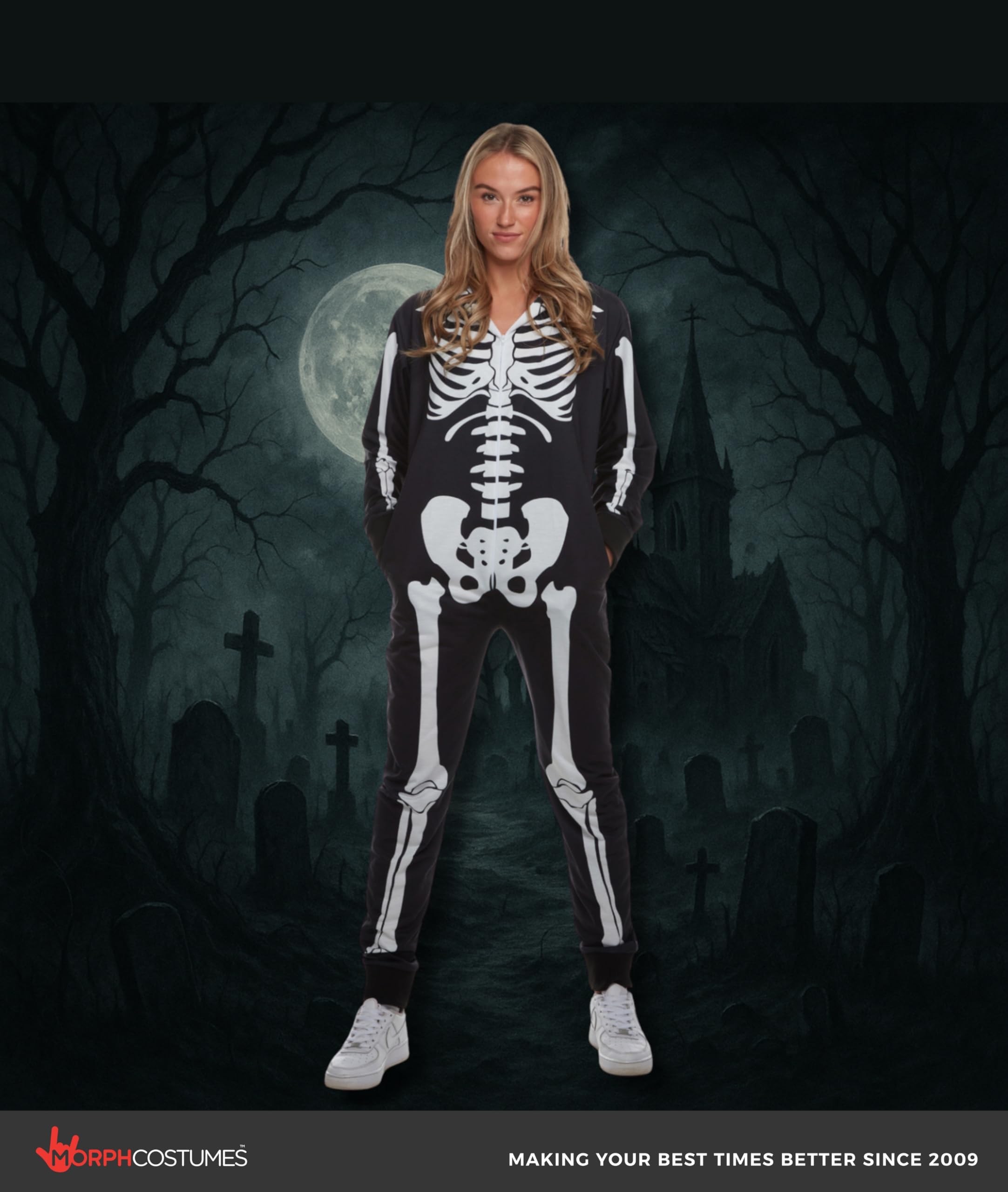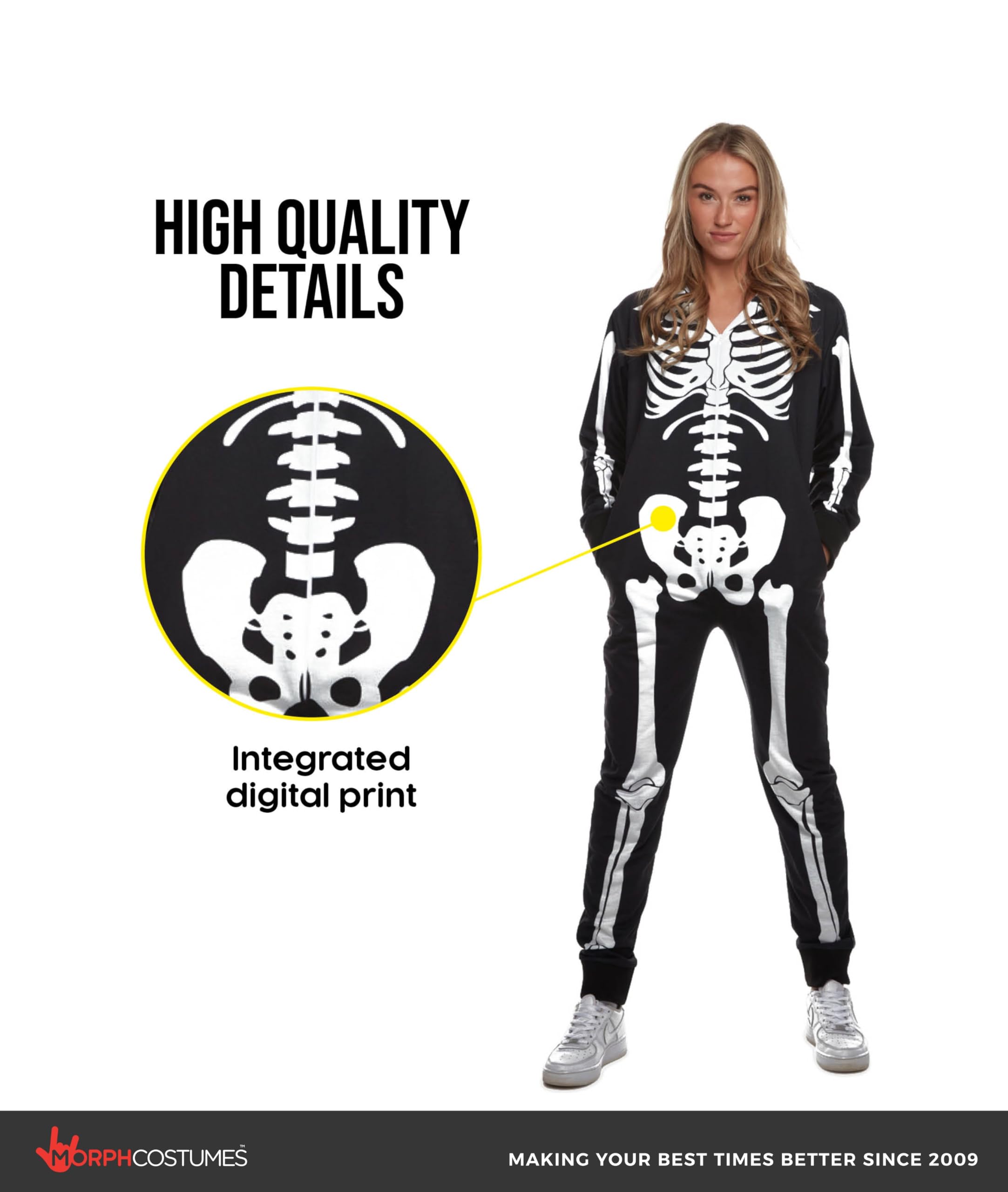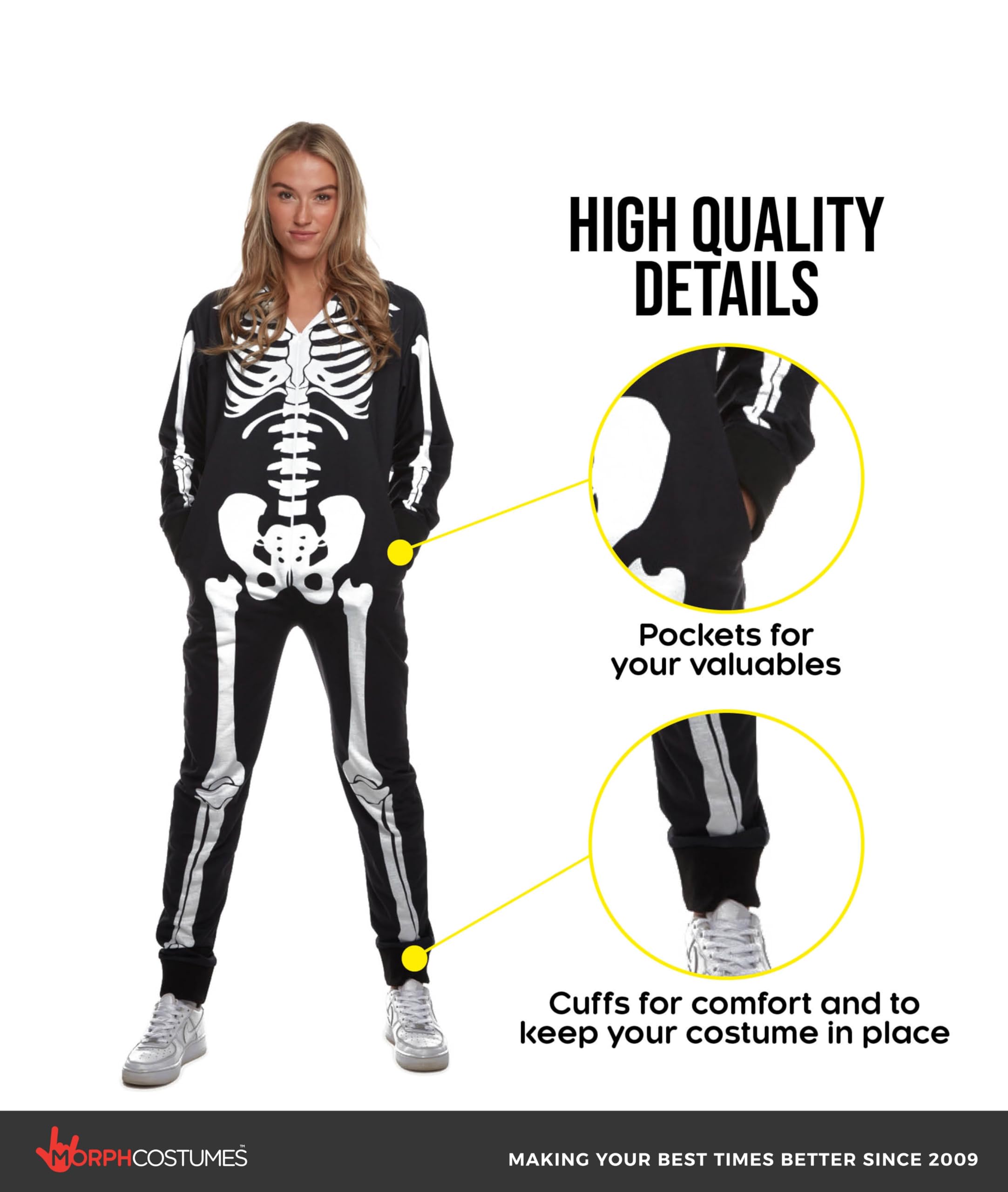 Complete skeleton jumpsuit: Includes a black one-piece skeleton jumpsuit with printed bone details, cozy hood, deep pockets, and elastic cuffs for the ultimate womens skeleton costume.