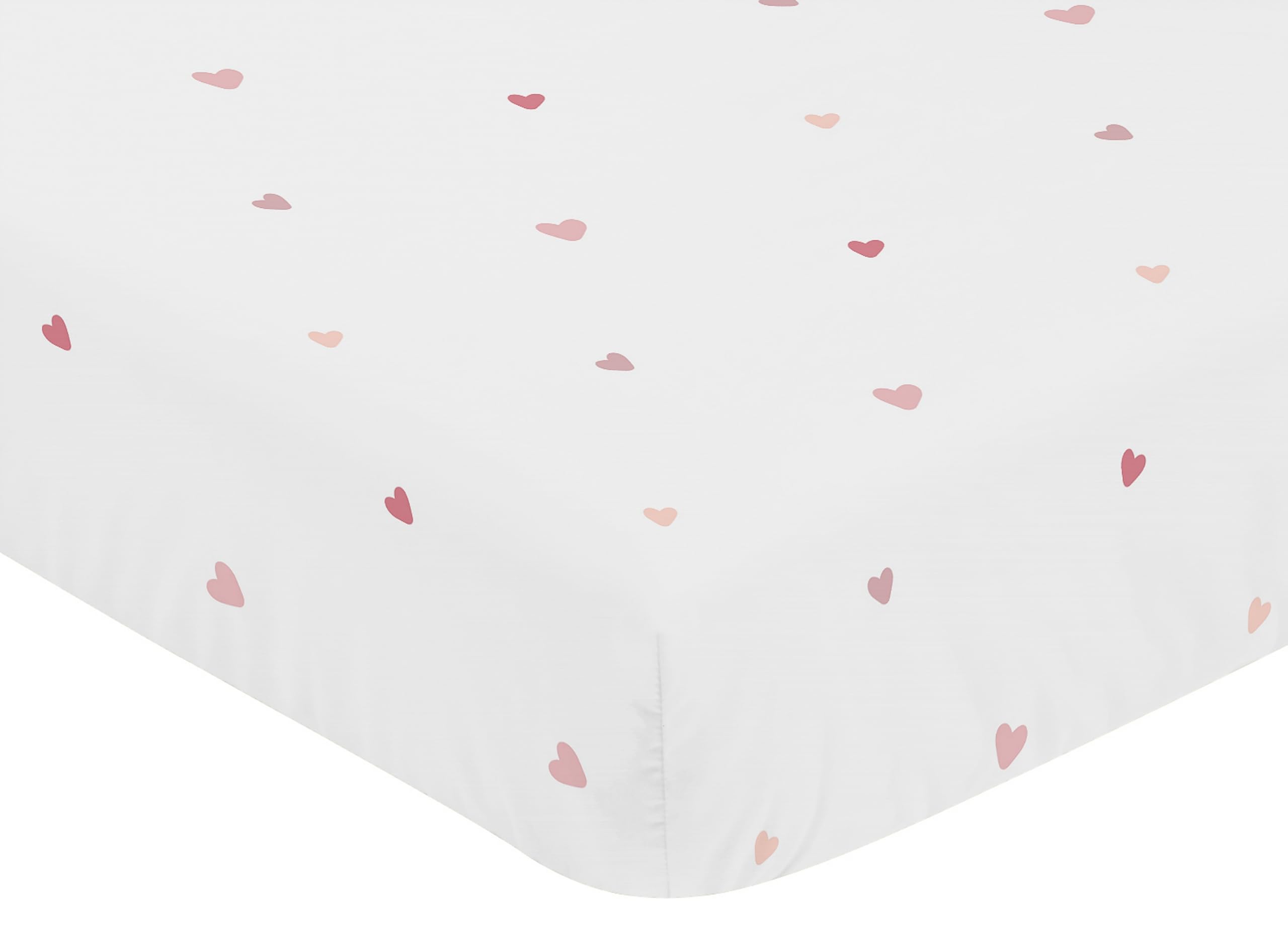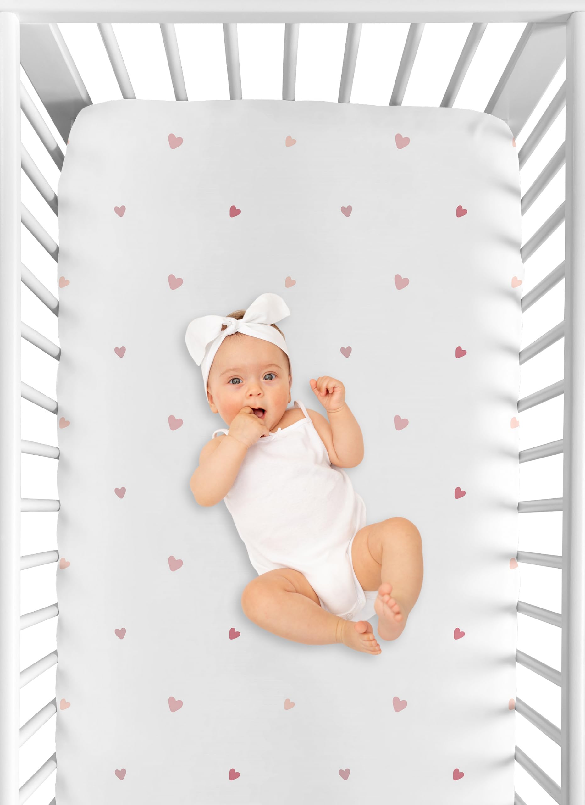 This brushed microfiber crib sheet features an exclusive design of a blush pink, mauve and dusty rose boho bohemian shabby chic polka dot heart print and made to match the Boho Rainbow and Hearts Collection