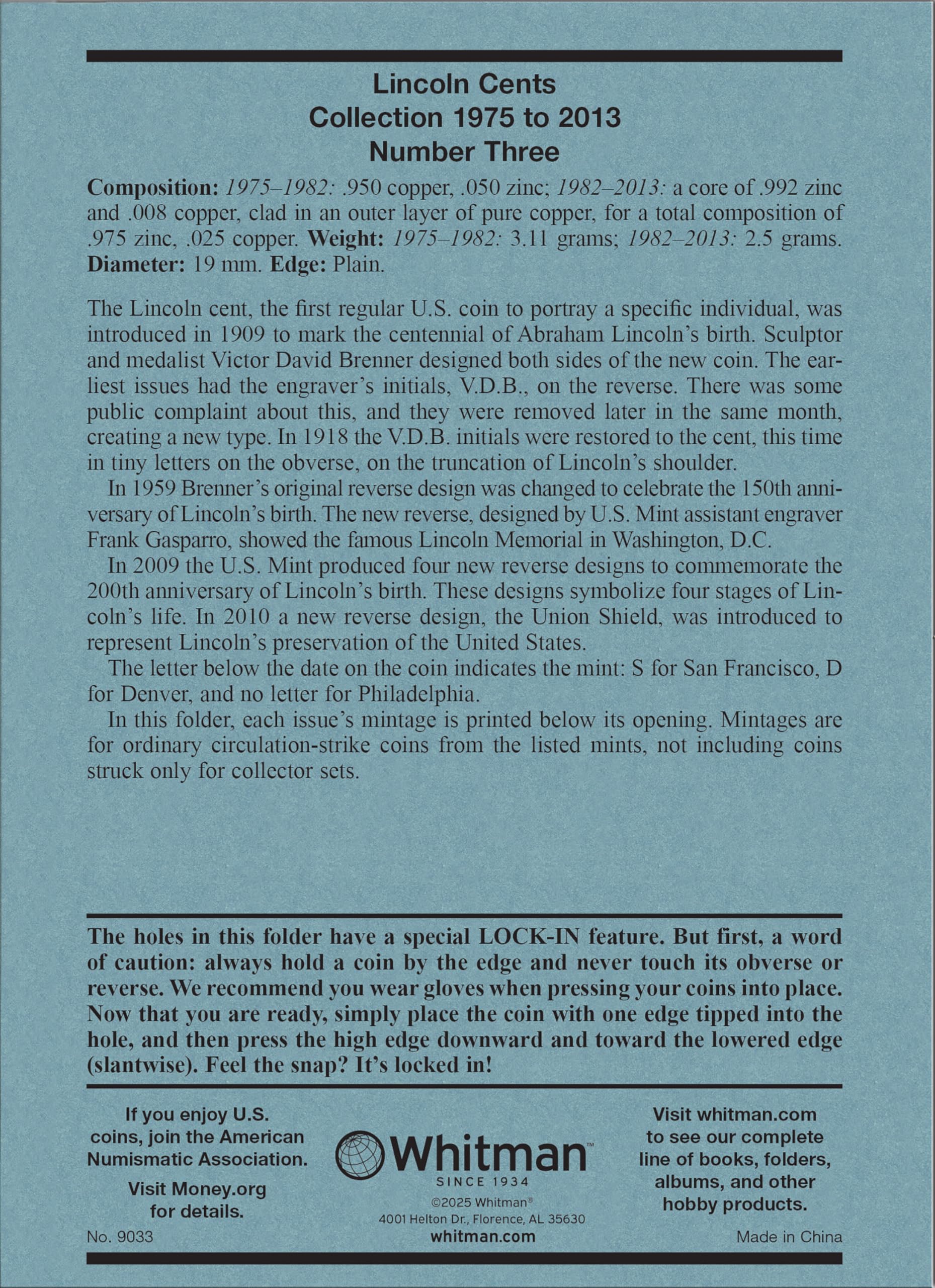 Official Whitman® coin folders offer a timeless and dependable way to store, protect, and display your coin collection for years to come. Ideal for both beginners and seasoned collectors, these durable trifold folders feature Whitman’s signature grained vinyl cover in classic blue. With labeled openings for easy organization and identification, each folder also includes historical background, mintage data, and series details. *The trusted choice for coin collectors. * This folder includes 3 pages with a total of 90 openings designed for circulation-strike coins from the Philadelphia and Denver mints from the specified years.