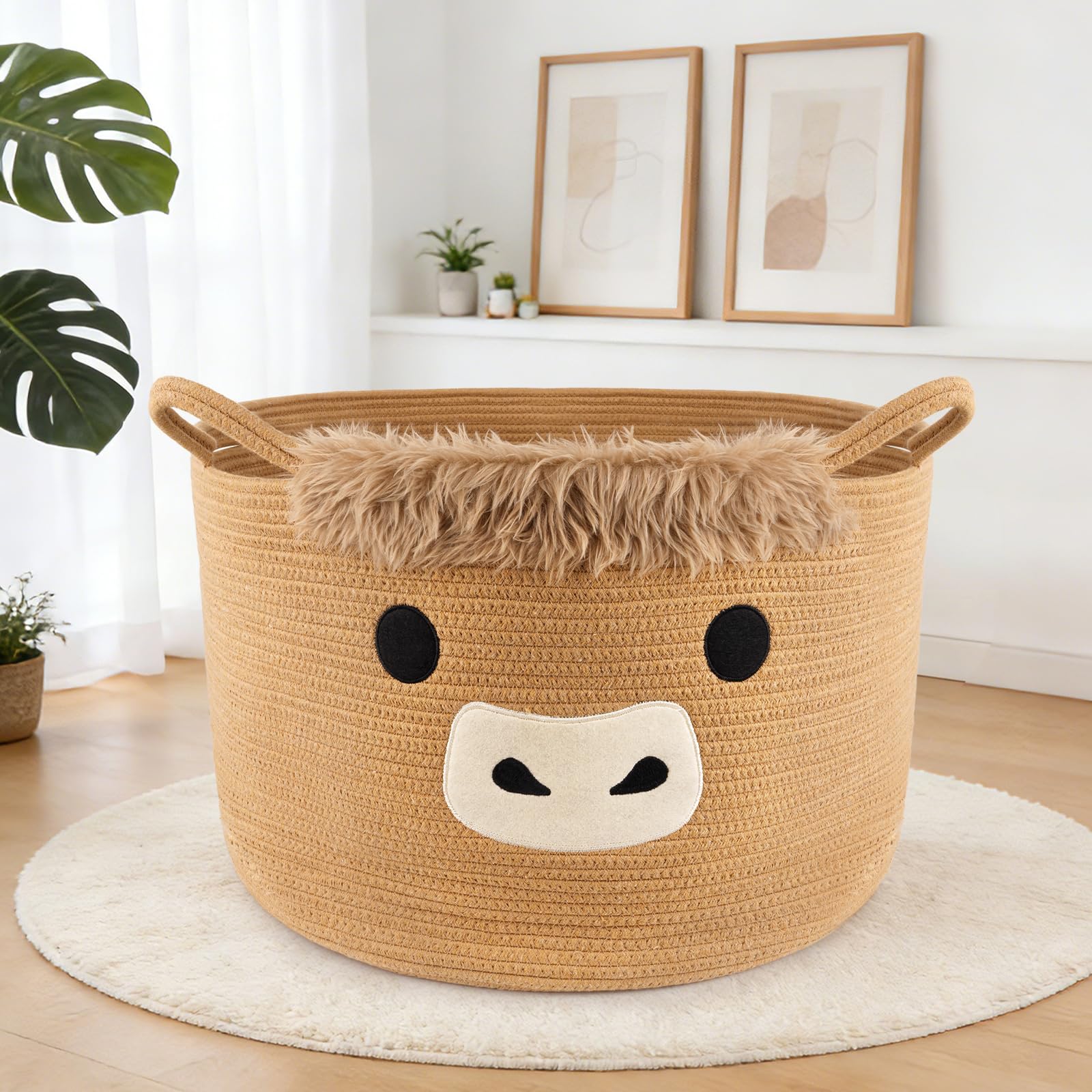 Product: Large Highland Cow Cute Woven Basket Feature: Size: 23(L) x 12(W) x 13(H) inches Color: Beige Brown Shaped: Highland Cow Material: Made of woven cotton rope, soft to touch, reinforced stitching Fuctions: 🐮 Extra Large Highland Cow Storage Basket We've designed this generous 23"x13" highland cow basket to be your blanket storage and large laundry basket. Soft, skin-friendly cotton rope, it’s perfect as a family-sized extra large blanket basket or a spacious storage basket for essentials. The sturdy woven cow-ear handles make moving blankets, laundry, or bulk items both easy and charming. 🧺 Spacious Organizer This large highland cow basket for blankets organizes your space without crowding. From throw blankets and pillows and towels, it’s an ideal basket for blankets living room and an essential woven basket for nursery, bedroom, or living areas. 🏠 Functional Home Essential More than a basket—it’s your go-to blanket holder, laundry bin! Use it as a pet basket, a blanket storage basket, or a stylish cotton rope basket that adds rustic charm while keeping every room tidy. 🎁 Thoughtfully Design A functional and decorative extra large highland cow basket that’s ready to impress! Perfect as a practical housewarming gift or a family-friendly organizer, it folds neatly when not in use—a high-quality for any home.