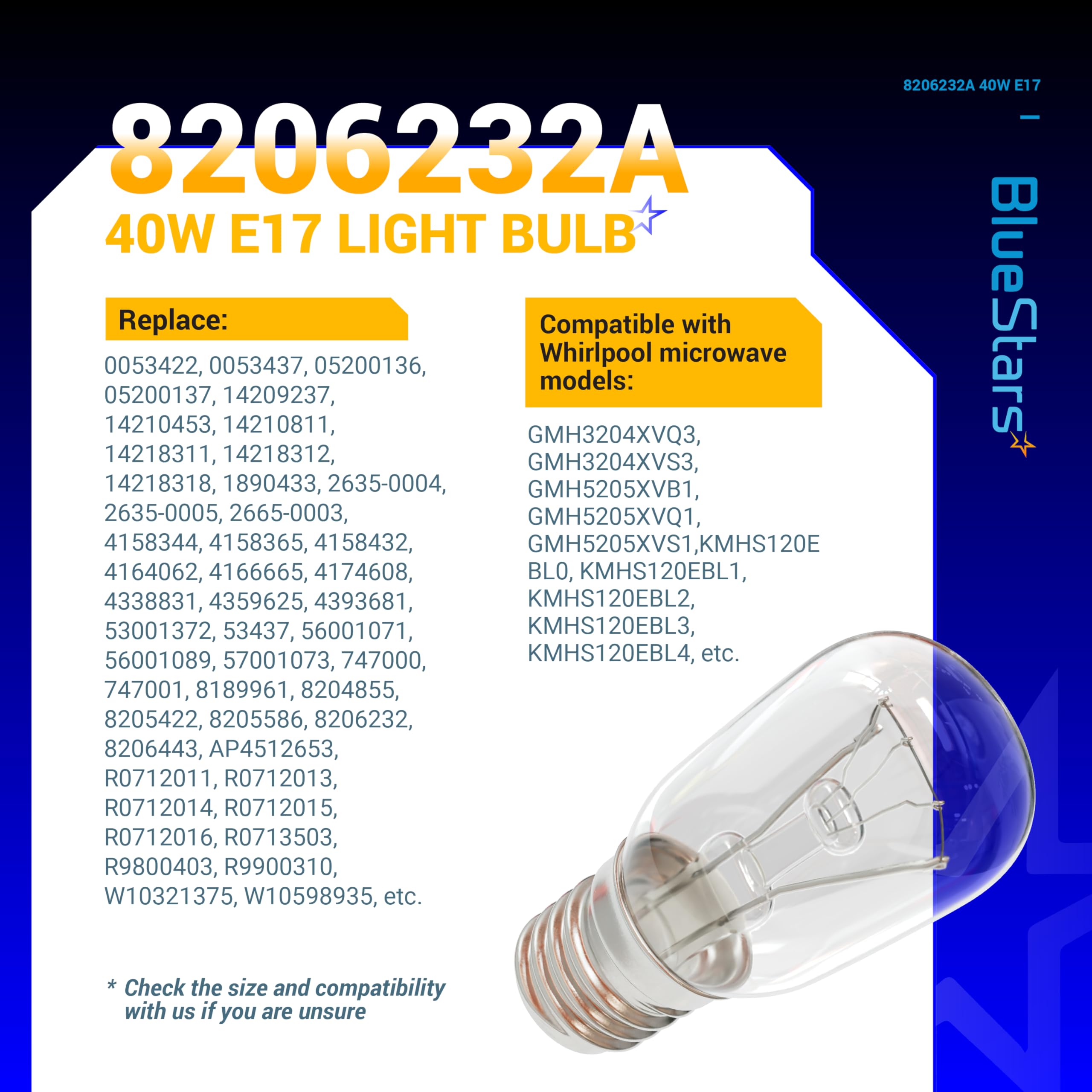 MULTIFUNCTION BULBS WITH PREMIUM QUALITY: The 8206232A E17 40W microwave light bulbs are used for repairing different small household appliances including microwaves, the lava lamps, refrigerators, ovens, fans, sewing machines, etc. These whirlpool microwave light bulbs are made from durable high quality material and well-tested by the manufacturer - Meets OEM standards - Ensure long-lasting and effective performance.