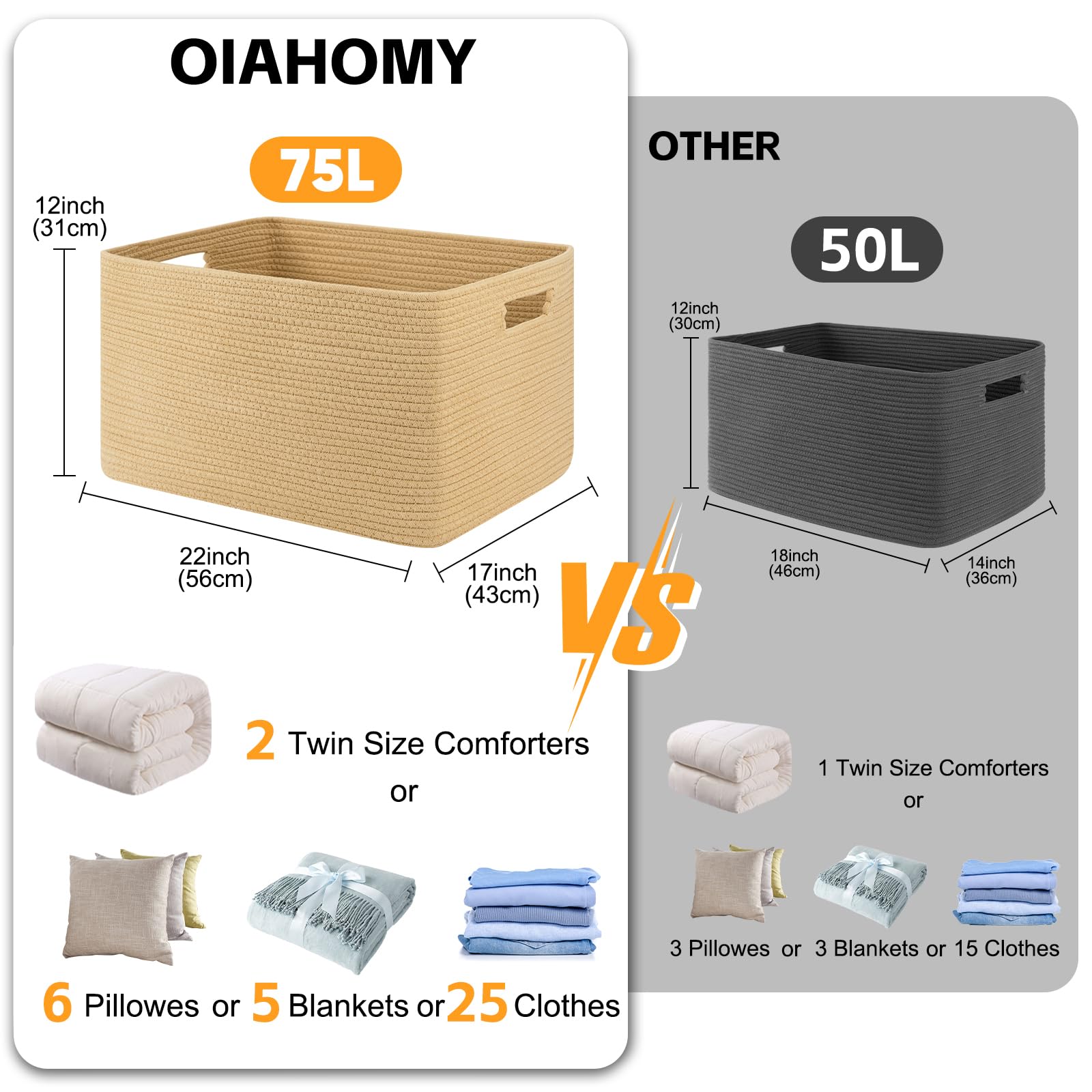 OIAHOMY Cotton Rope Storage Basket We want to design a basket that fits all the rooms to meet your storage needs. Some storage space is designed for small objects, such as drawers and desktop organizers. Big objects also have storage needs, like baby’s clothes, blankets, toys, dirty clothes etc. Baskets are designed expressly for them. The woven basket is very soft and lightweight but strong enough to stand up by itself even when it is empty. This blanket basket can also keep your every room tidy and clean. Specifications about the storage basket: Material: cotton Color: Grey/ Yellow/ Blue/White Size: 22’’ x 17’’ x 12’’ Notifications: The woven organizer will be folded for shipping purposes, please fill it with the towels or clothes, it will back to the original shape in short time. Multiple purpose: Living room: OIAHOMY rope woven basket can be used to store the blankets, pillows, cushions, clothes and so on. Organized your living room and keep the floor and sofa tidy. Baby room: Our storage basket can work as a nursery basket in baby’s room. The nursery basket can store babay’s toys, clothes, blankets and so on. Please don’t hesitate anymore, add it to your cart and purchase it right now!