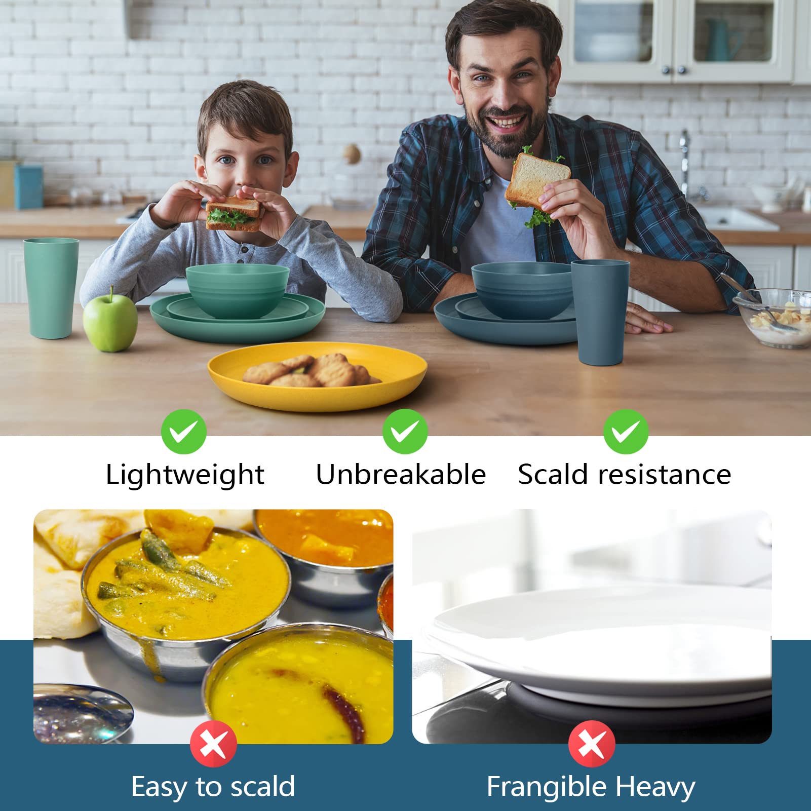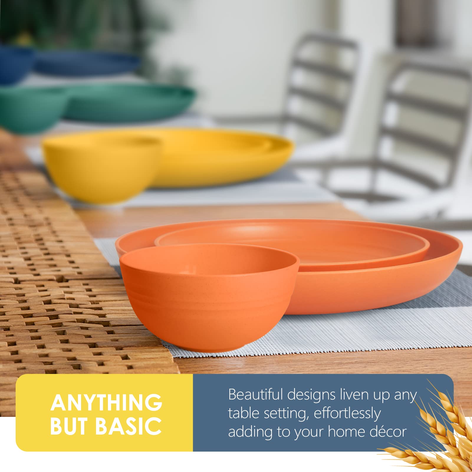 MATERIAL: Made of wheat straw and plastic material. 100% BPA free. Sturdy and durable, will not break or chip like porcelain or ceramic.