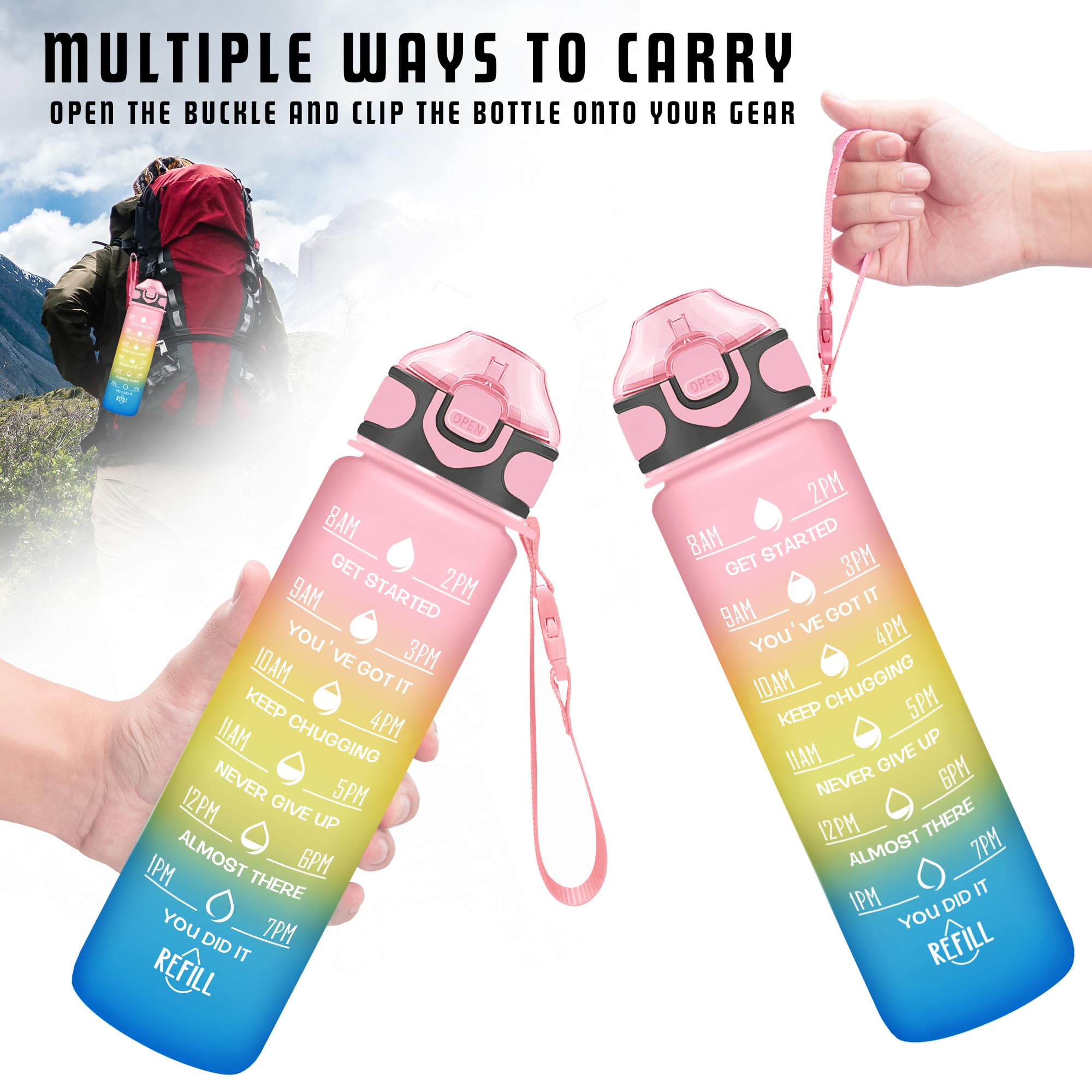 [Fucking handle design] Our water bottle bars are strap and release buckle. You can choose the type of free or handle, so that you can connect 32 ounces of water bottle to your backpack, bicycle or travel bag. Use wide mouth opening, easy to clean and add ice cubes. Very suitable for travel, hiking, gym, and indoor or outdoor activities.