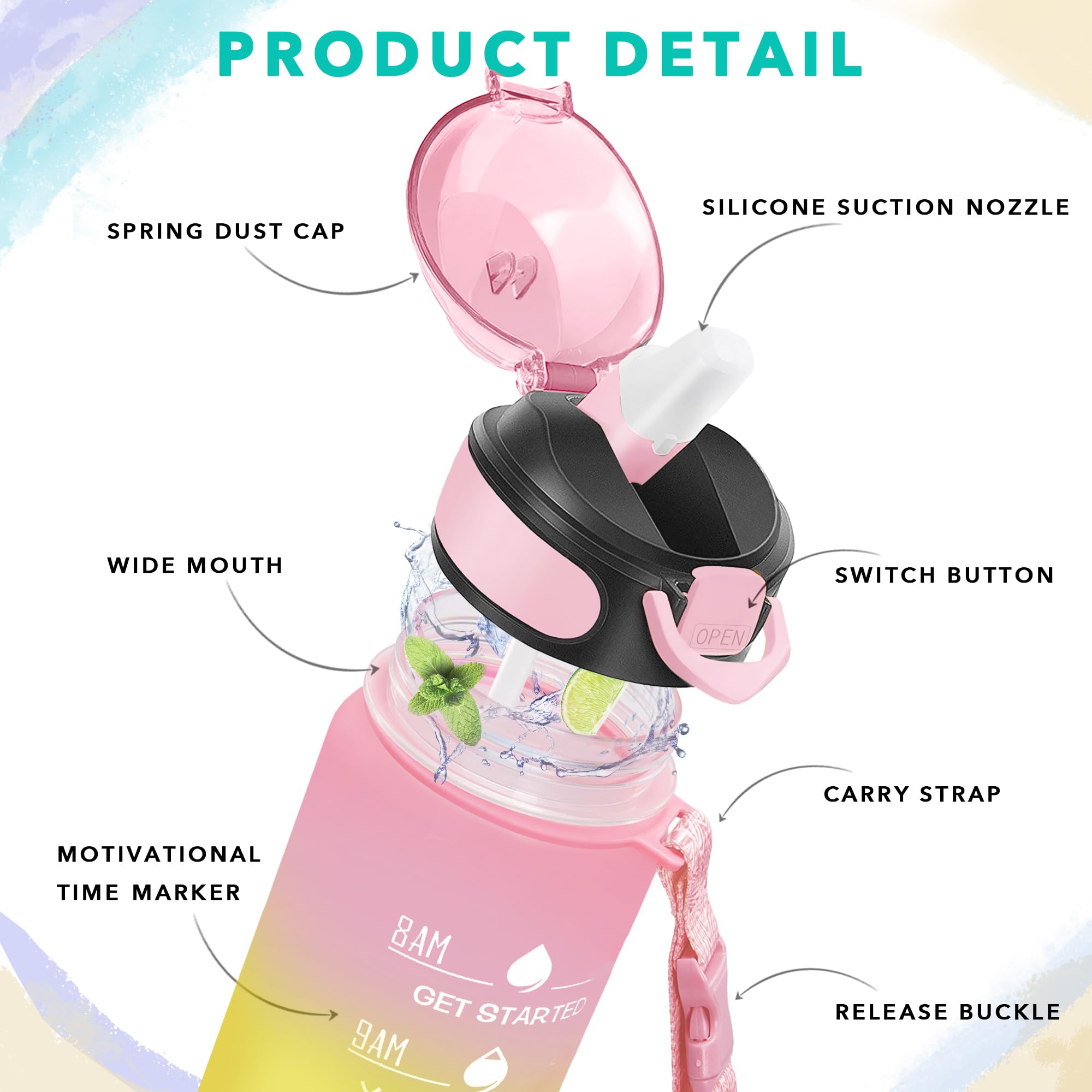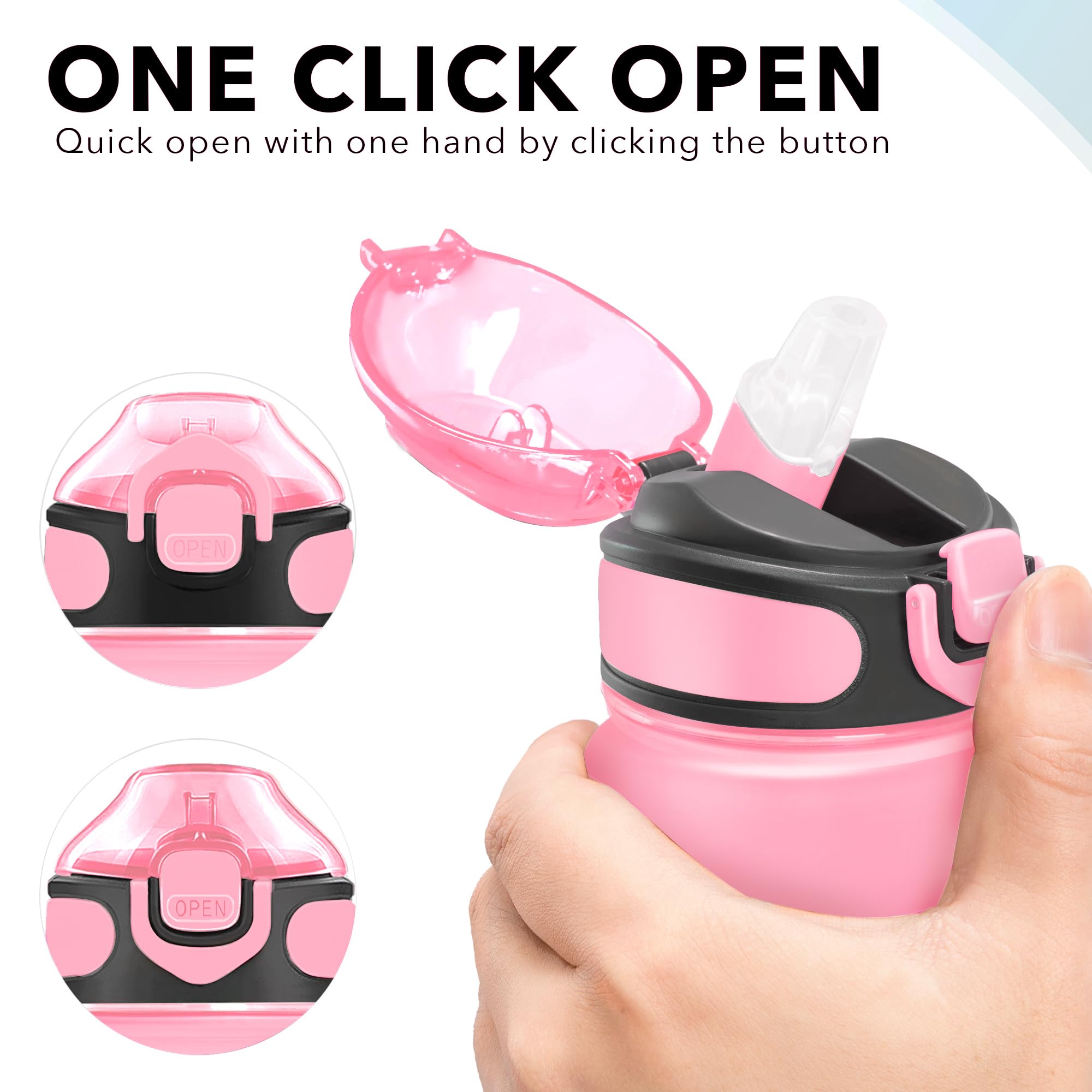 [Humanized design] Open one hand, click the button to enter the water. Very suitable for boys and girls and all ages. The flip cover is designed withlock design, dustproof and leakage. Using scrubs with water cups can be better held.