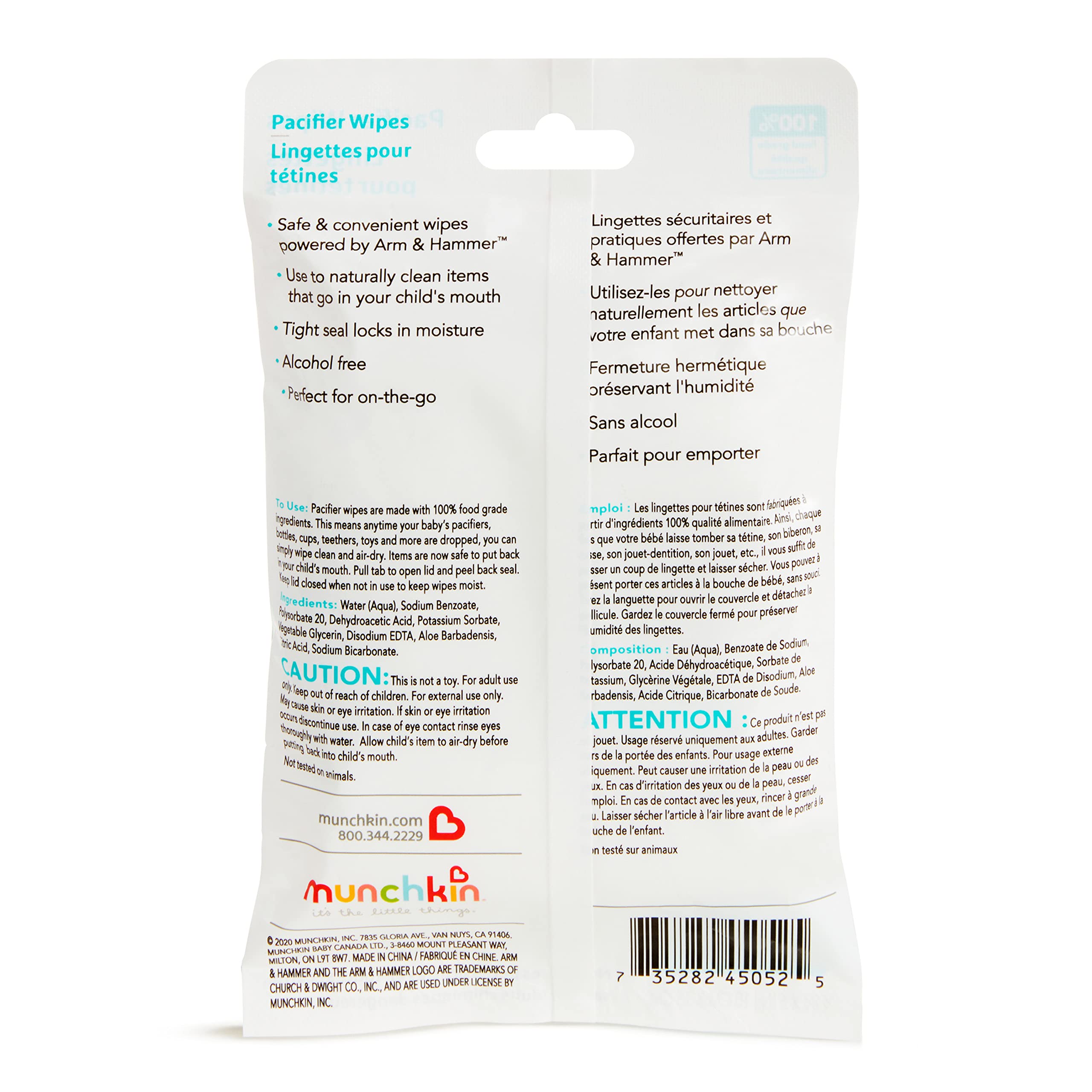 Product Description Cleaning baby's favorite pacifiers and teething toys is a breeze with Arm and Hammer Pacifier Wipes. This convenient pack of 36 wipes is great for home use and on the go. Cleans bottles, pacifiers, teething toys, cups and more quickly, safely and naturally without harsh chemicals or alcohol. 100% Food grade. Brand Story By Munchkin From the Manufacturer Cleaning baby's favorite pacifiers and teething toys is a breeze with Arm and Hammer Pacifier Wipes. This convenient pack of 36 wipes is great for home use and on-the-go. Cleans bottles, pacifiers, teething toys, cups and more quickly, safely and naturally without harsh chemicals or alcohol. 100% Food grade.