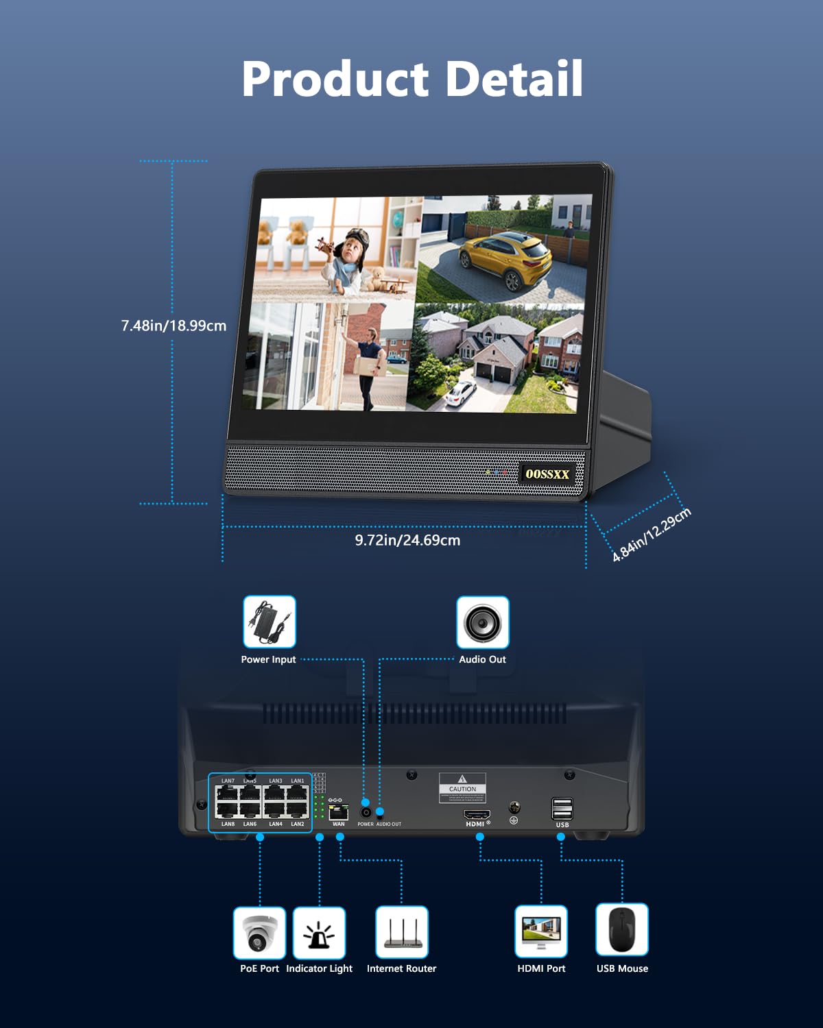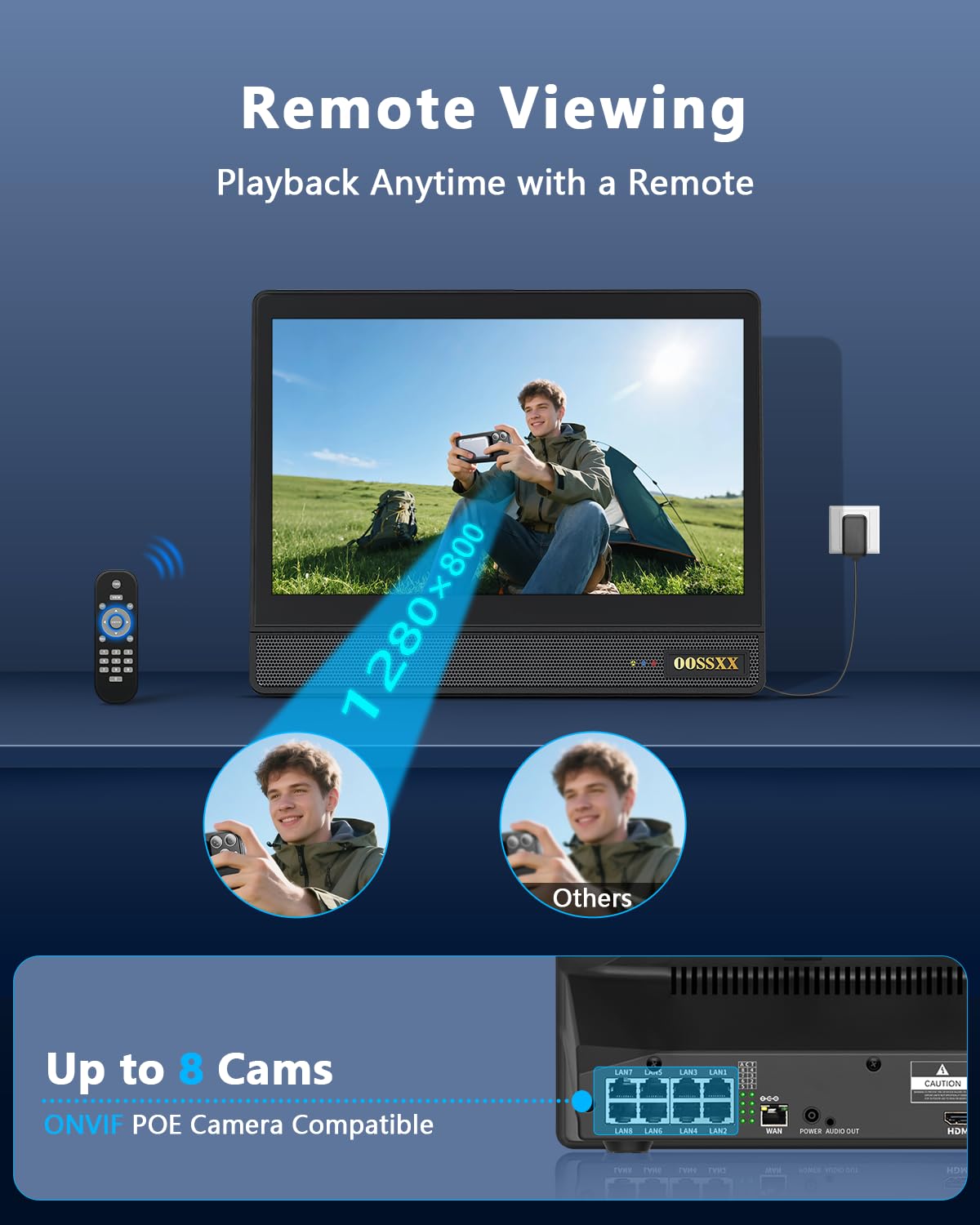 OOSSXX 8.0/4K Megapixel 8-Channel POE NVR Network Video Recorder All-in-One Monitor NVR, Supports up to 8 x 8MP/4K IP Cameras, Max to 6TB Hard Drive (HDD Not Included)
