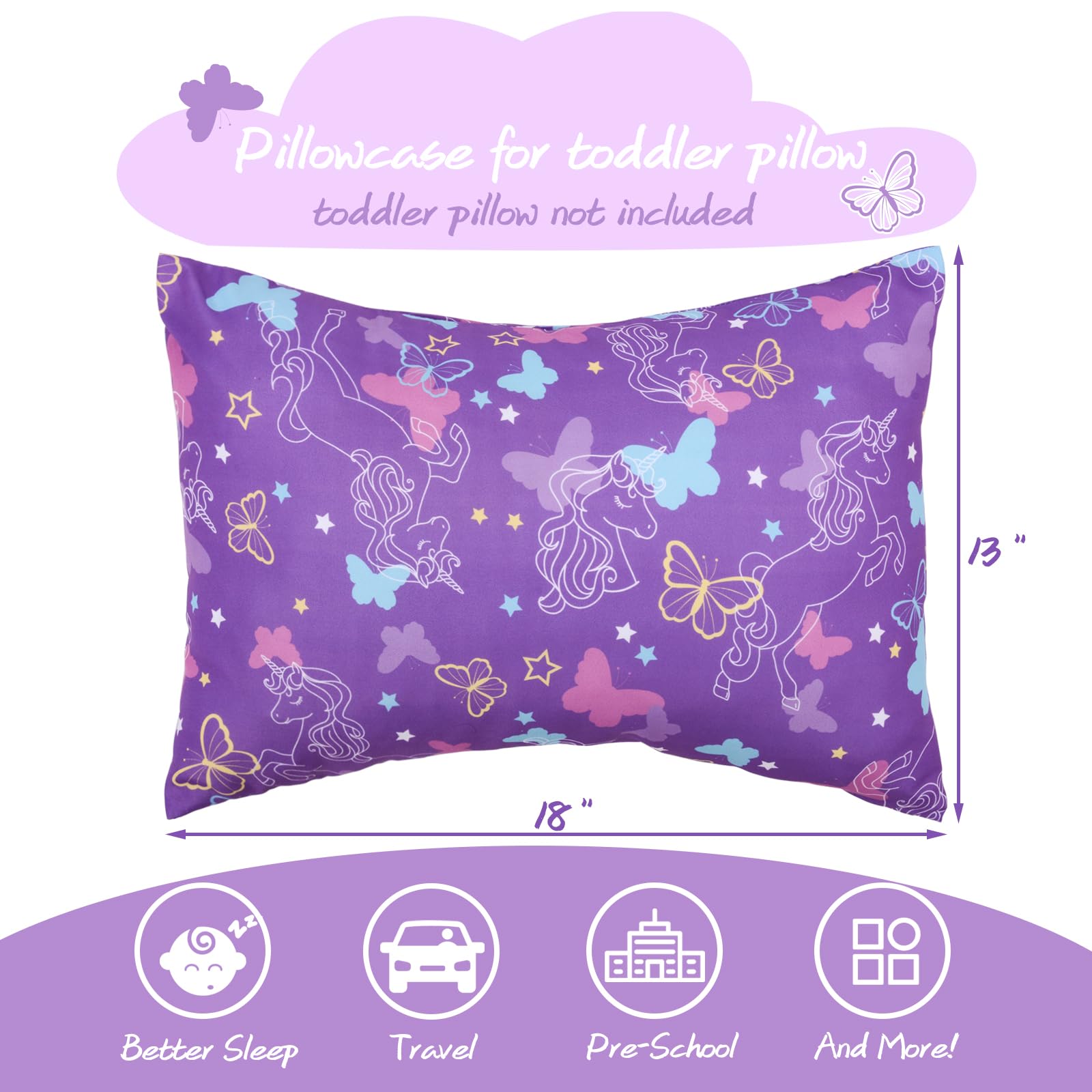 【TODDLER PILLOWCASE SIZE】: Butterfly Toddler Pillowcases 13 x 18 inch for baby girls 2 pack (PILLOWS ARE NOT INCLUDED).100% polyester purple toddler Pillow Case breathable lightweight fabric, which is gentle to the touch and your baby's delicate skin.Fits toddler pillows sized 13x18,12 x 16, 14 x 19 inches.