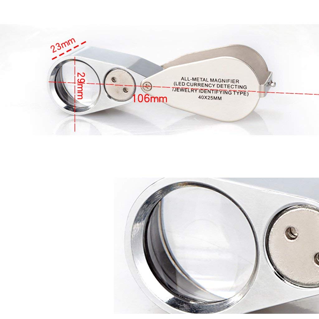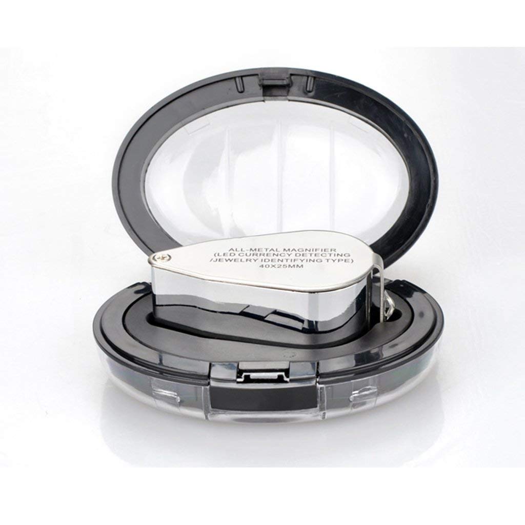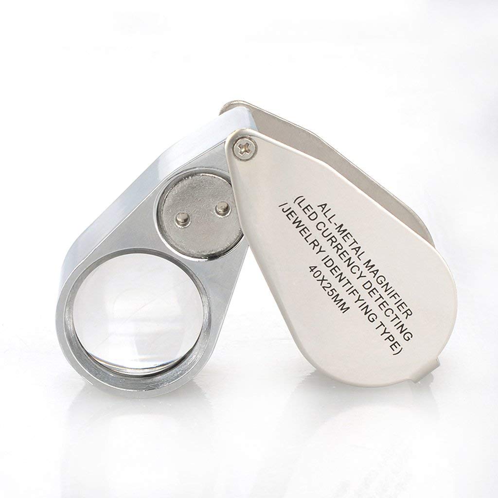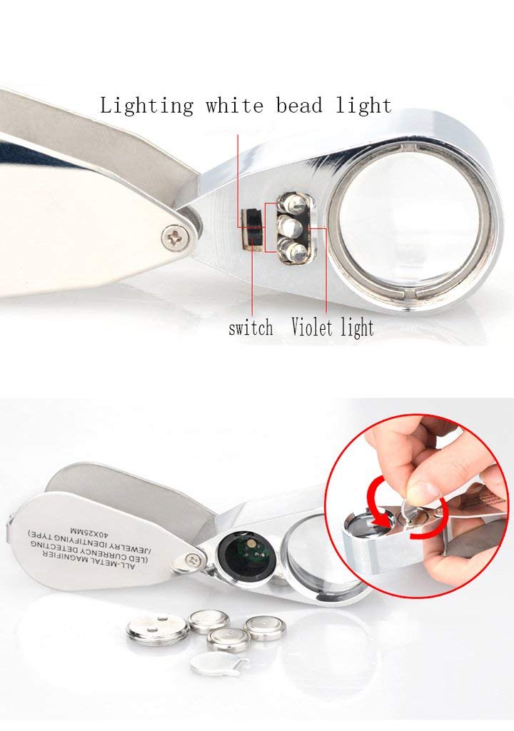 Bright LED and UV light: you can see objects clearly in dark or insufficient light conditions with this dual LED light source. The UV light works as a counterfeit detector for things such as the paper currency, passports, Credit cards, and traveler's checks etc., pocket magnifying glasses is design for Jewelry Authentication, Good for Gems, Jewelry, Rocks, Stamps, Coins, Watches, Hobbies, Antiques, Models, Photos Industry.
