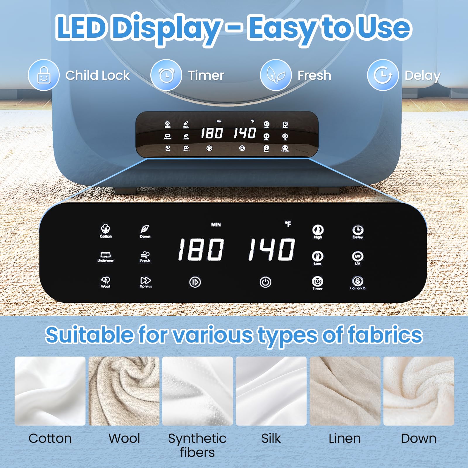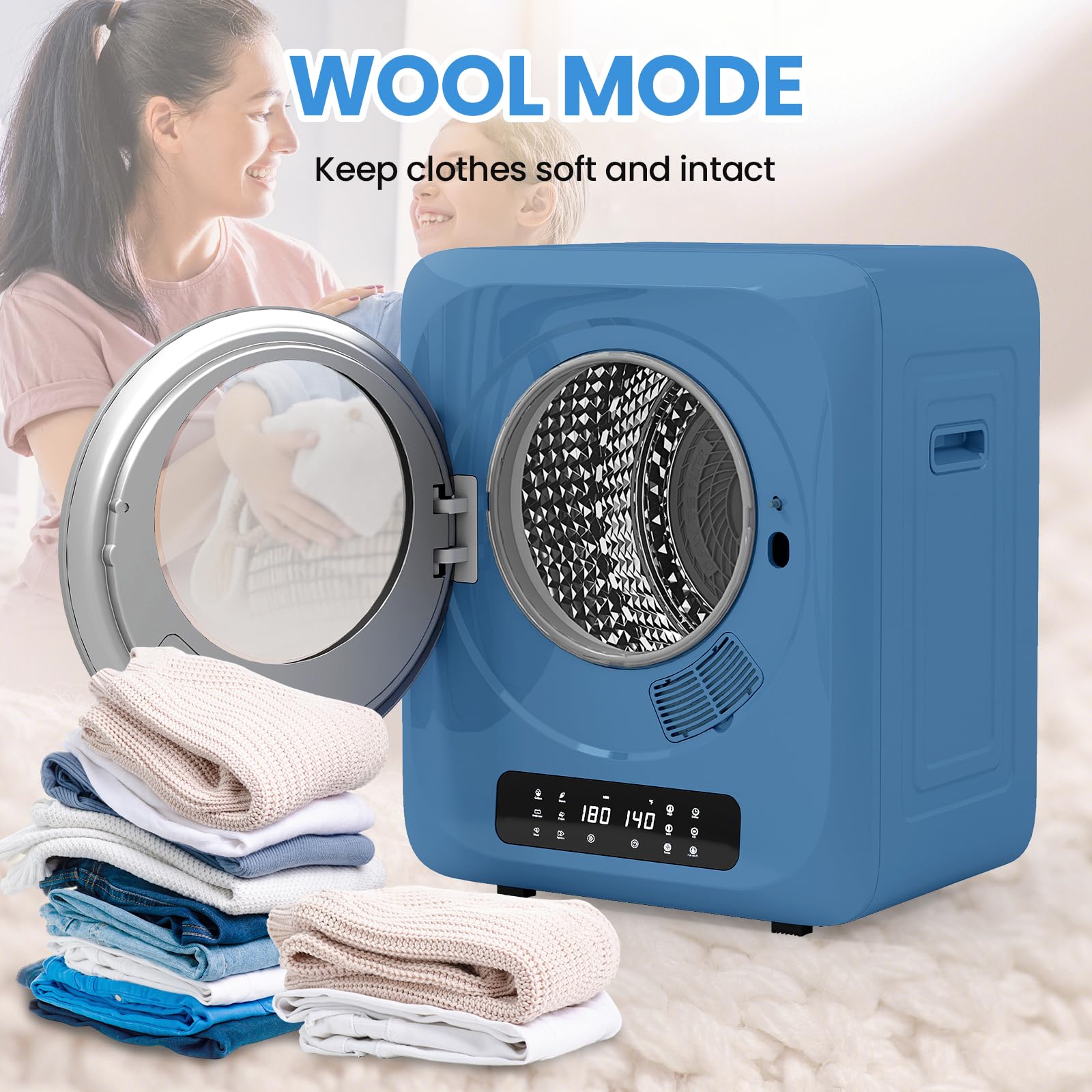 [6 Drying Modes] The dryer is equipped with an LED smart touchscreen, featuring 6 modes tailored to different fabrics: strong drying for cotton & linen, fluffy care for down, gentle drying for underwear, low-temperature shrinkage prevention for wool, refresh & deodorize, and quick drying for emergencies—meeting diverse needs. The inner tub's forward-reverse rotation design effectively prevents clothes from tangling and wrinkling. The tempered glass door allows easy monitoring of the process, and the magnetic door lock ensures safe use.