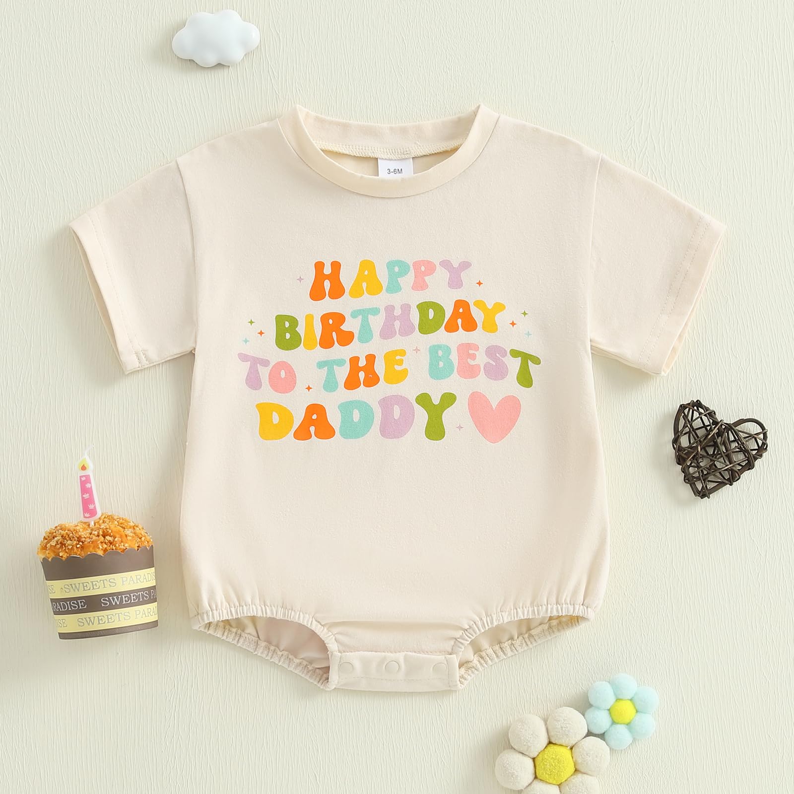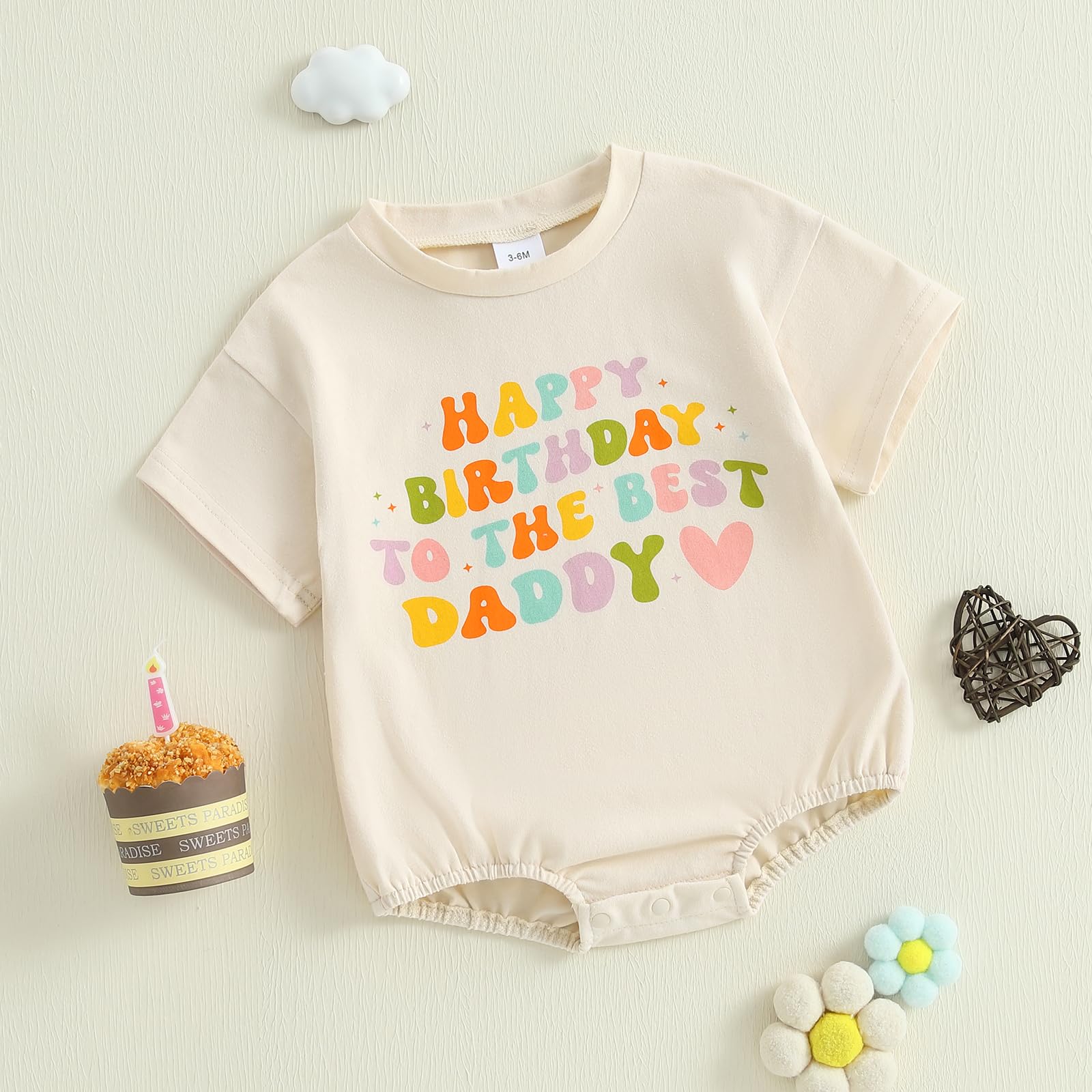 Design: Adorable baby girl boy short sleeve romper, crew neck, Happy Birthday To The Best Daddy colorful letter print, oversized bodysuit overalls, snap closure for diaper change. Cute and chic baby girl boy bubble romper, makes your little one more lovely and attractive