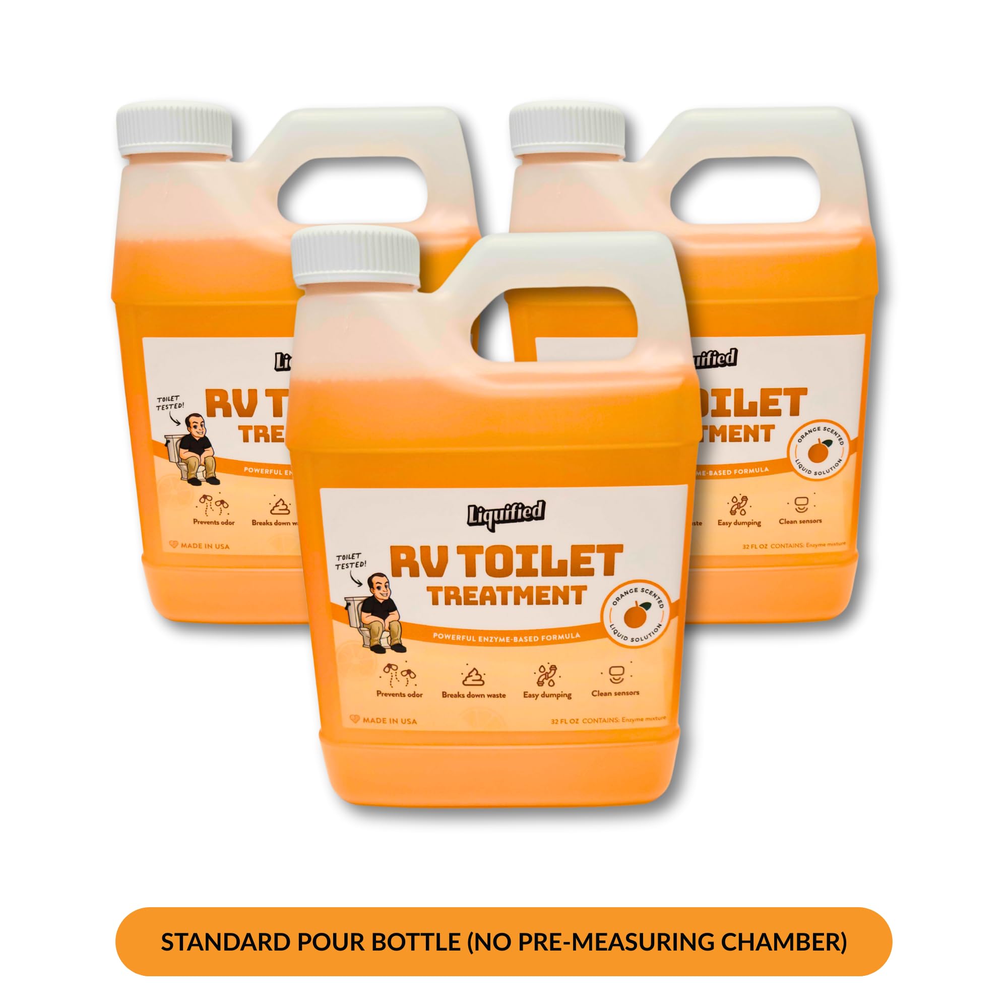 Breaks Down Waste for Easy Dumping: Our enzyme-based solution liquifies solid waste and toilet paper to make dumping smooth and easy. Eliminate years of build-up in your black tank with our powerful formula. Fights Against Tank Odor: Get rid of foul black tank odor at the source with this product. This breaks down odor-causing bacteria and leaves a wonderful orange scent. Helps Prevent Sensor Malfunction: Its cleaning superpower helps eliminate years of buildup on sensors so you can get a more accurate reading of your black tank levels. 100% Biodegradable: Our formula is environmentally friendly and safe for all septic systems. It contains no formaldehyde so you can feel safe with it around pets and children. Made in USA: Liquified is proudly made in Elkhart, Indiana--the RV capital of the world! We have listened to feedback from fellow RVers to create this amazing product.