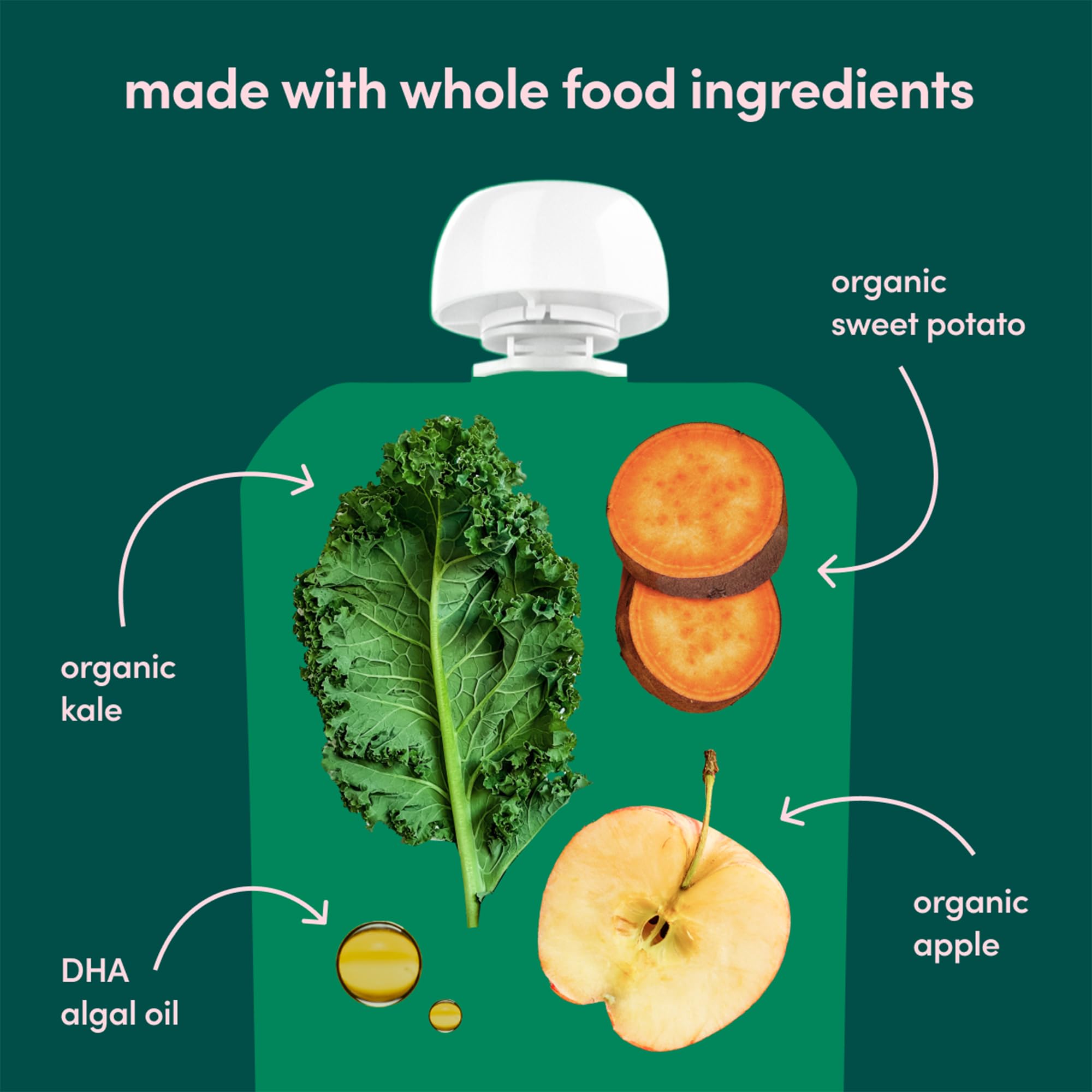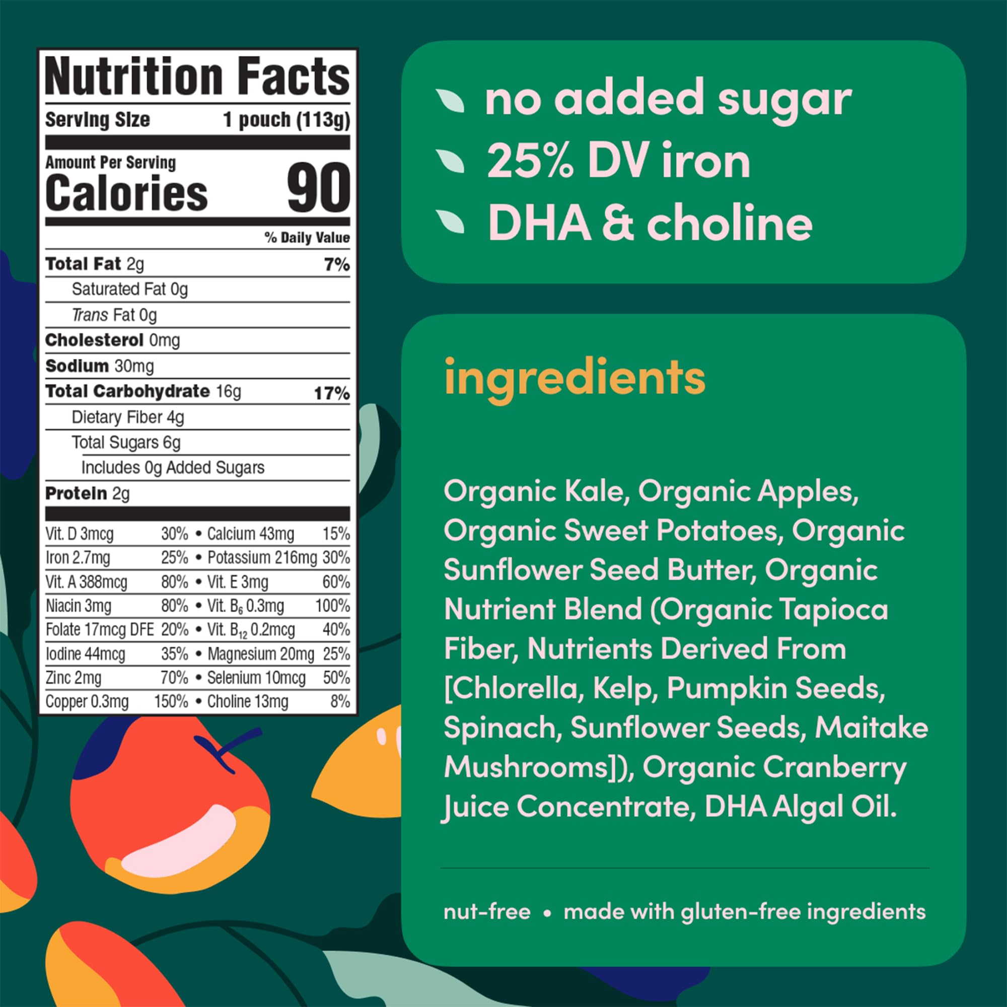 VEGGIE FIRST & NO ADDED SUGAR – Made with kale, sweet potato & apple, no added sugar, gluten, dairy or nuts